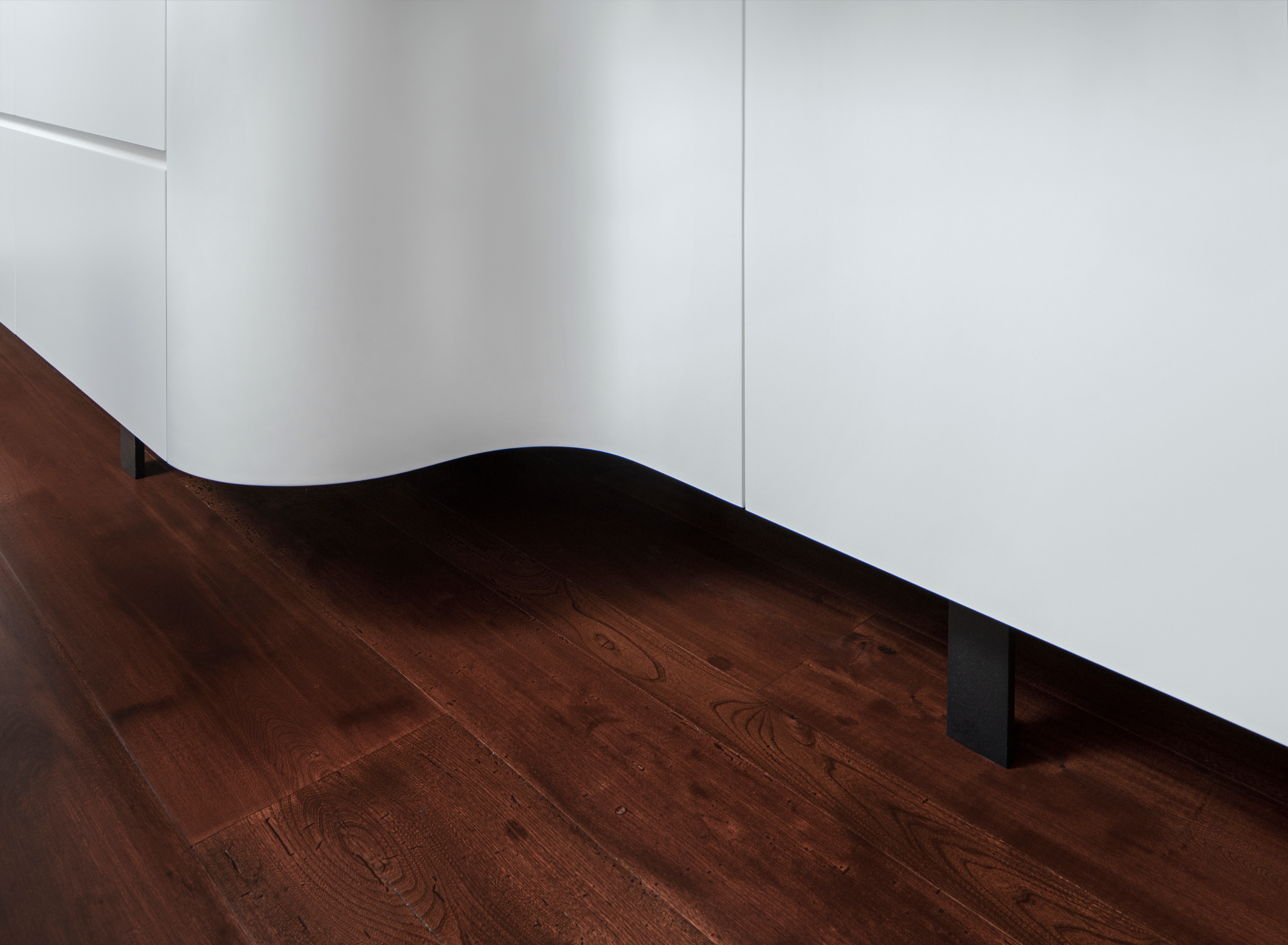 Podobną zasadę zastosowano w kuchni, w której szafki oraz powierzchnie ze stali nierdzewnej wyraźnie odcinają się od historycznego deskowania. Wyspa kuchenna z subtelnie zakrzywioną podstawą i przedłużonym blatem tworzy wygodny barek śniadaniowy.