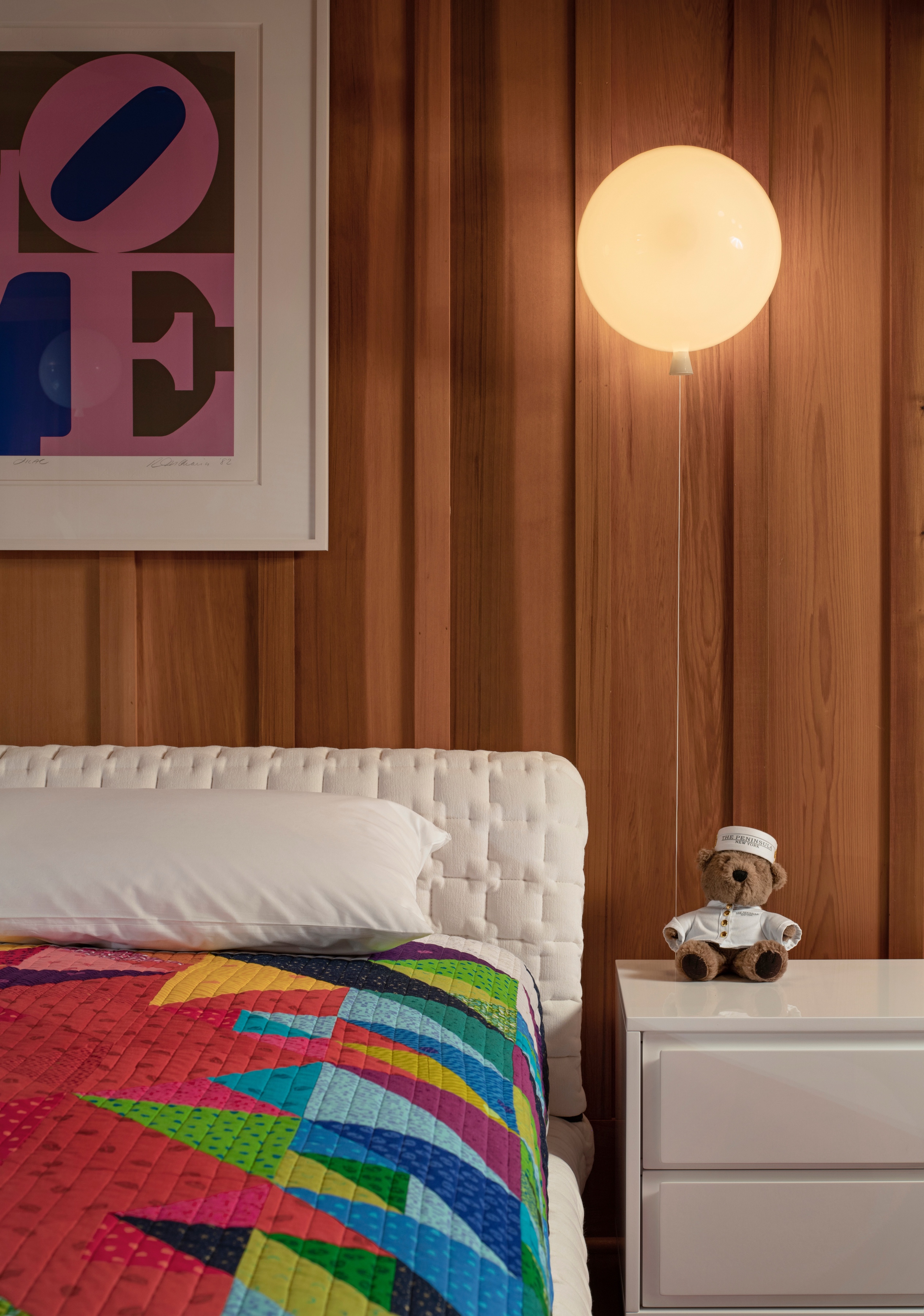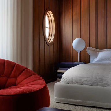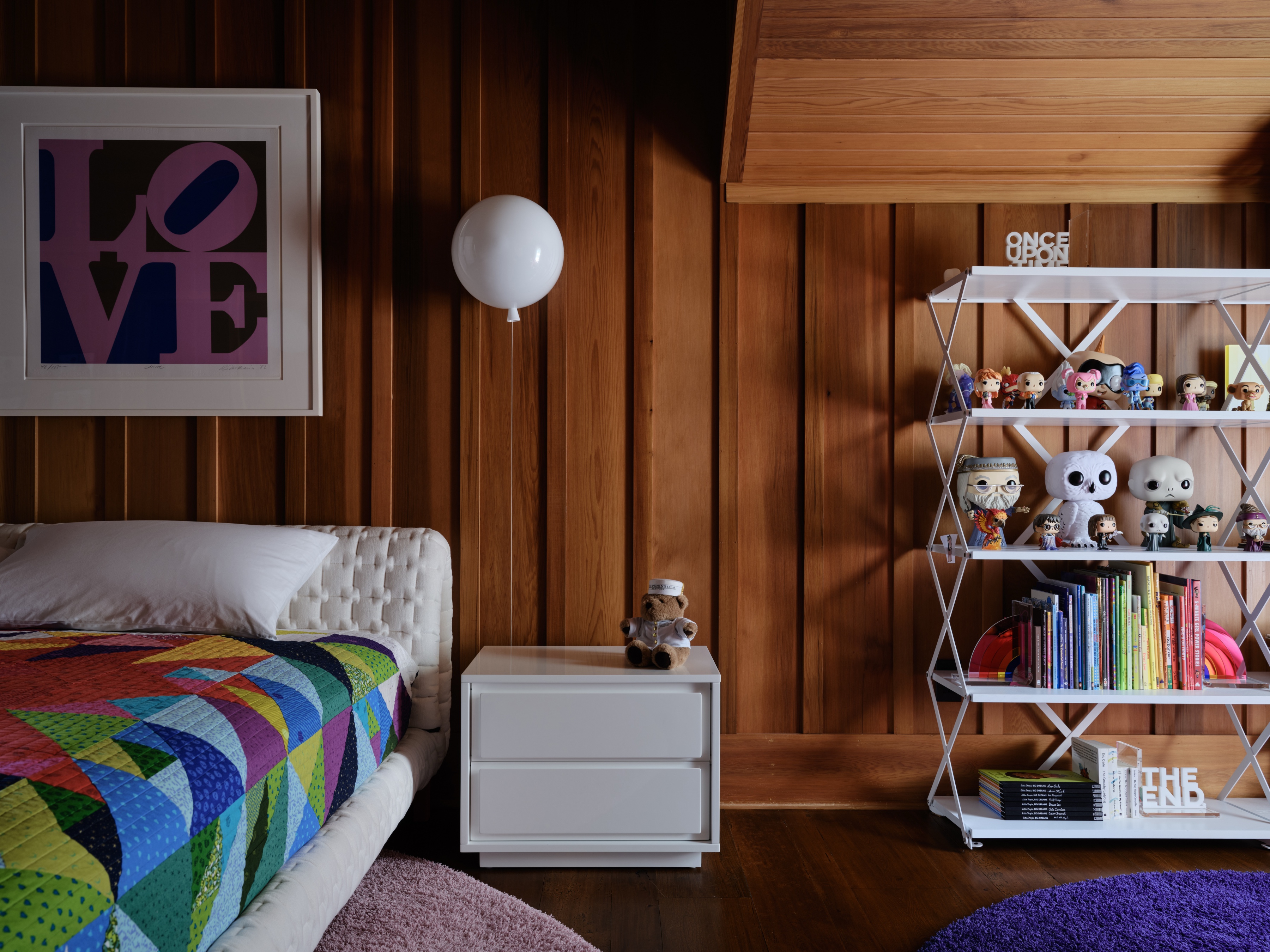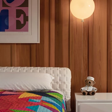 Meble w całym domu potraktowano z dużą dawką fantazji, bawiąc się ich skalą i teksturą. W salonie wzrok przyciąga ogromna lampa Anglepoise, która swoimi rozmiarami zmienia perspektywę patrzenia na sąsiednie pomieszczenia. Duże, kopułowe lampy wiszące budują z kolei wizualną ciągłość między kuchnią, jadalnią a korytarzem. Sześć sypialni urządzono w podobny sposób, używając kolorowych tekstur i zabawnych opraw oświetleniowych, co nadaje im lekki, niezobowiązujący charakter.