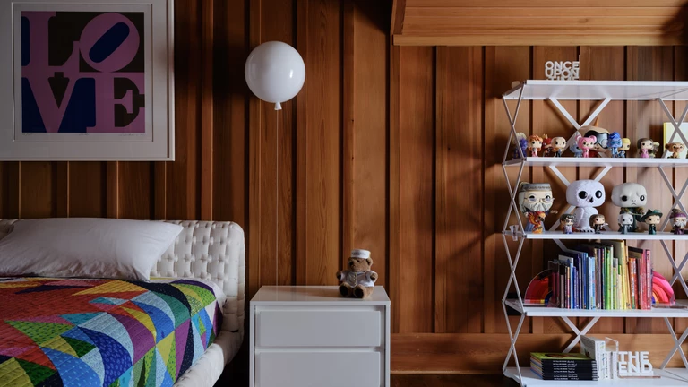 Kolor pojawia się tu oszczędnie, ale dynamicznie, głównie za sprawą starannie dobranych mebli i dodatków. Przykładem takiego podejścia jest strefa wejściowa, gdzie biała szafa i niebieska ławka funkcjonują jako samodzielna, nowoczesna rzeźba na tle drewnianych ścian.