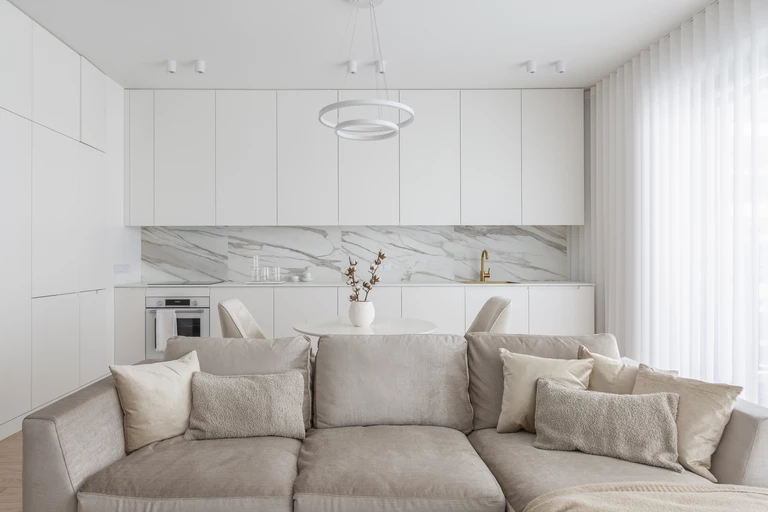 Mimo że mieszkanie utrzymano w przeważającej mierze w bieli, nie jest ono surowe czy zimne, wręcz przeciwnie – ujmuje przytulnym charakterem. Udało się uzyskać ten efekt dzięki ciepłym, beżowym odcieniom, które pojawiają się w dodatkach i na naturalnych, dębowych deskach podłogowych.