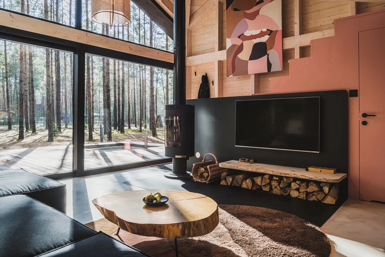 Prosta forma budynku i drewniane ściany zewnętrzne sprawiły, że budynek doskonale wkomponował się w leśne otoczenie. Wnętrze domu jest równie atrakcyjne, co jego strona zewnętrzna. Dominujące tu naturalne kolory przełamuje róż, który zdobi jedną ze ścian salonu, schody oraz łazienkę. Kominek, wszechobecne drewno, dodatki w stylu boho, ceramika i obrazy tworzą razem kojącą zmysły przestrzeń, do której zawsze chce się wracać.