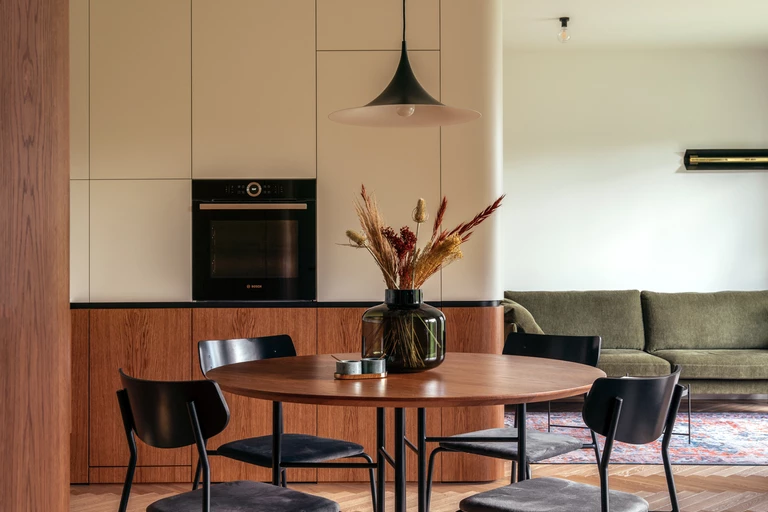 Sercem otwartej kuchni jest okrągły stół. Fornirowane fronty podkreślają mosiężne uchwyty. Sporą ilość drewna równoważy biel. Całość doprawiona jest czarnymi akcentami.