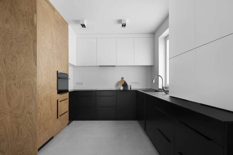 Oprócz minimalizmu właściciele mieszkania cenią sobie naturalne materiały – ich kolorystykę, fakturę oraz kojące działanie na człowieka. Z tego względu część mebli kuchennych wykonano z naturalnego forniru. Betonowa podłoga w większości pomieszczeń oraz sufit i podłoga z drewna tekowego w łazience nadały miękkości aranżacji. Stanowią przy tym doskonałe tło dla mocnego, czarno-białego dizajnu obecnego w projekcie. Naturalne materiały piękne komponują się z widokiem za oknem na uroczy park, który można podziwiać leżąc na wygodnej sofie hiszpańskiej marki Kave Home.