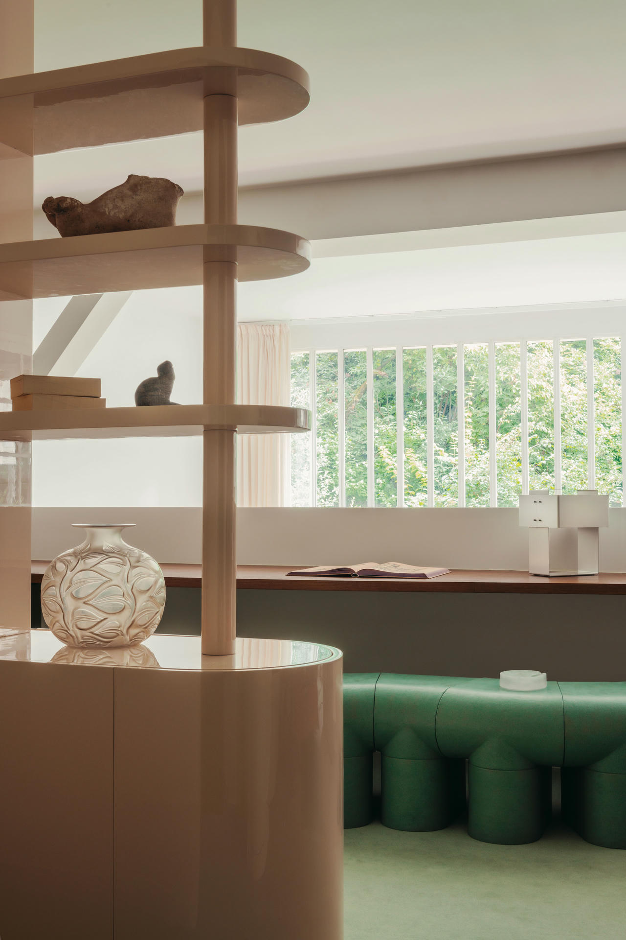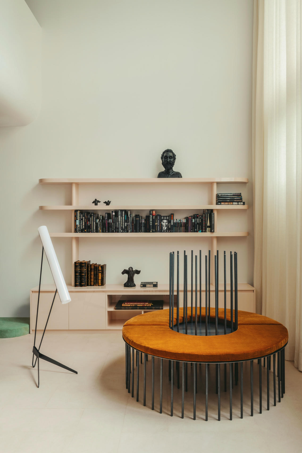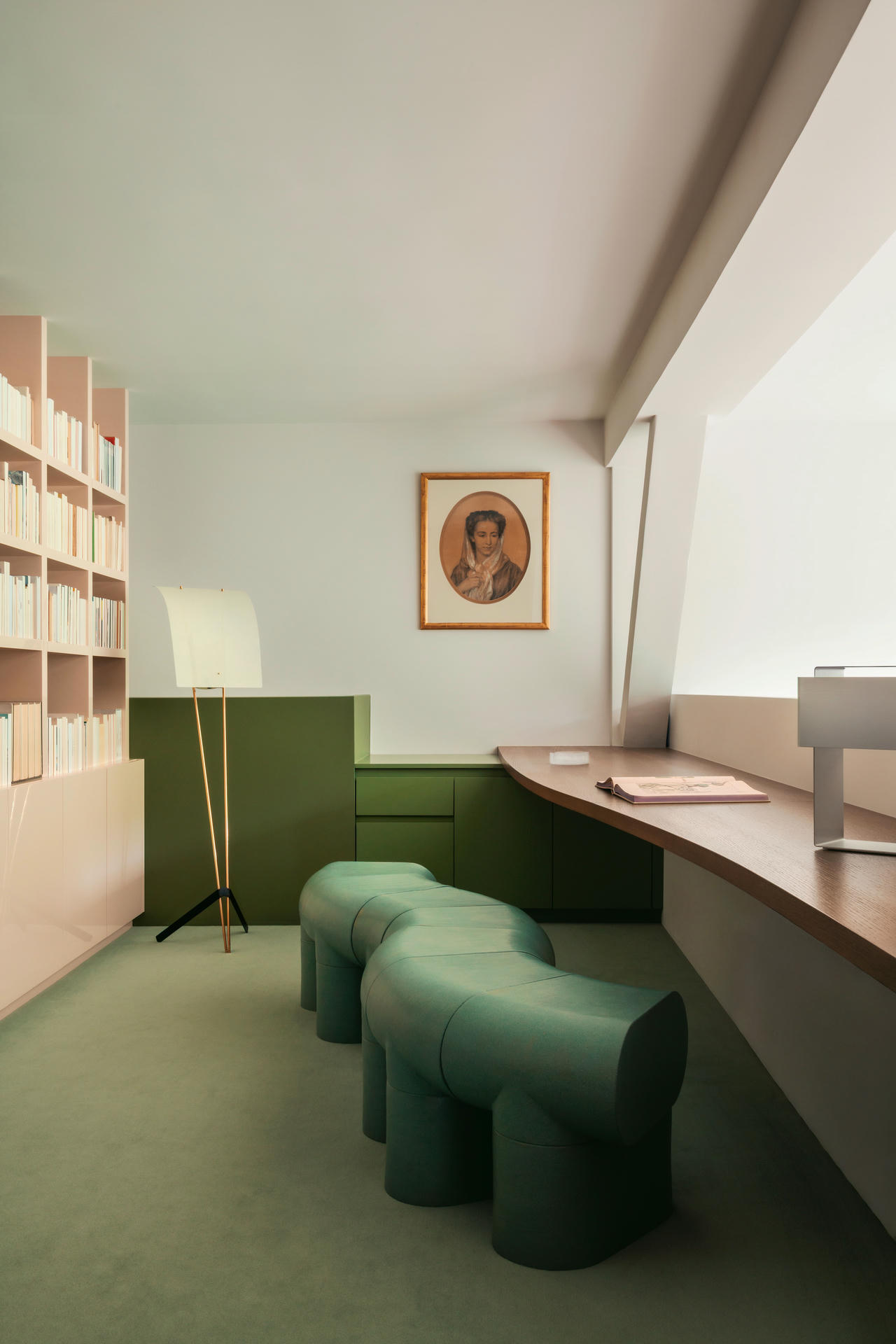 Biurko ustawione wzdłuż balustrady pozwala korzystać z widoku na wysokie okna i wizualnie niweluje kameralną skalę, a towarzysząca mu ceramiczna ławka Rina Claessensa oraz lampa podłogowa Pierre’a Guariche’a dopełniają kompozycję. Krzywizny i subtelny odcień różu wprowadzono, by złagodzić geometrię wnętrza.