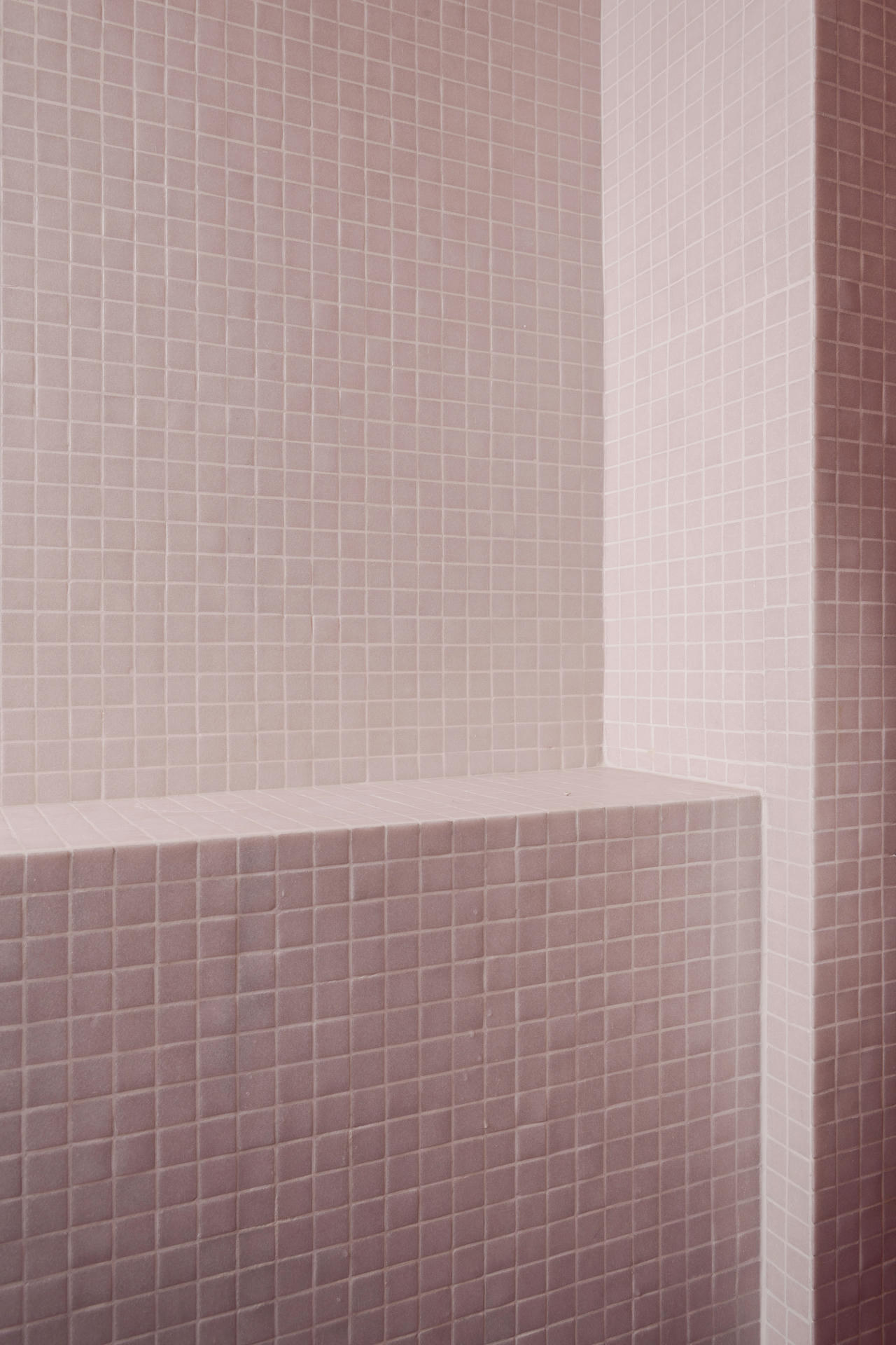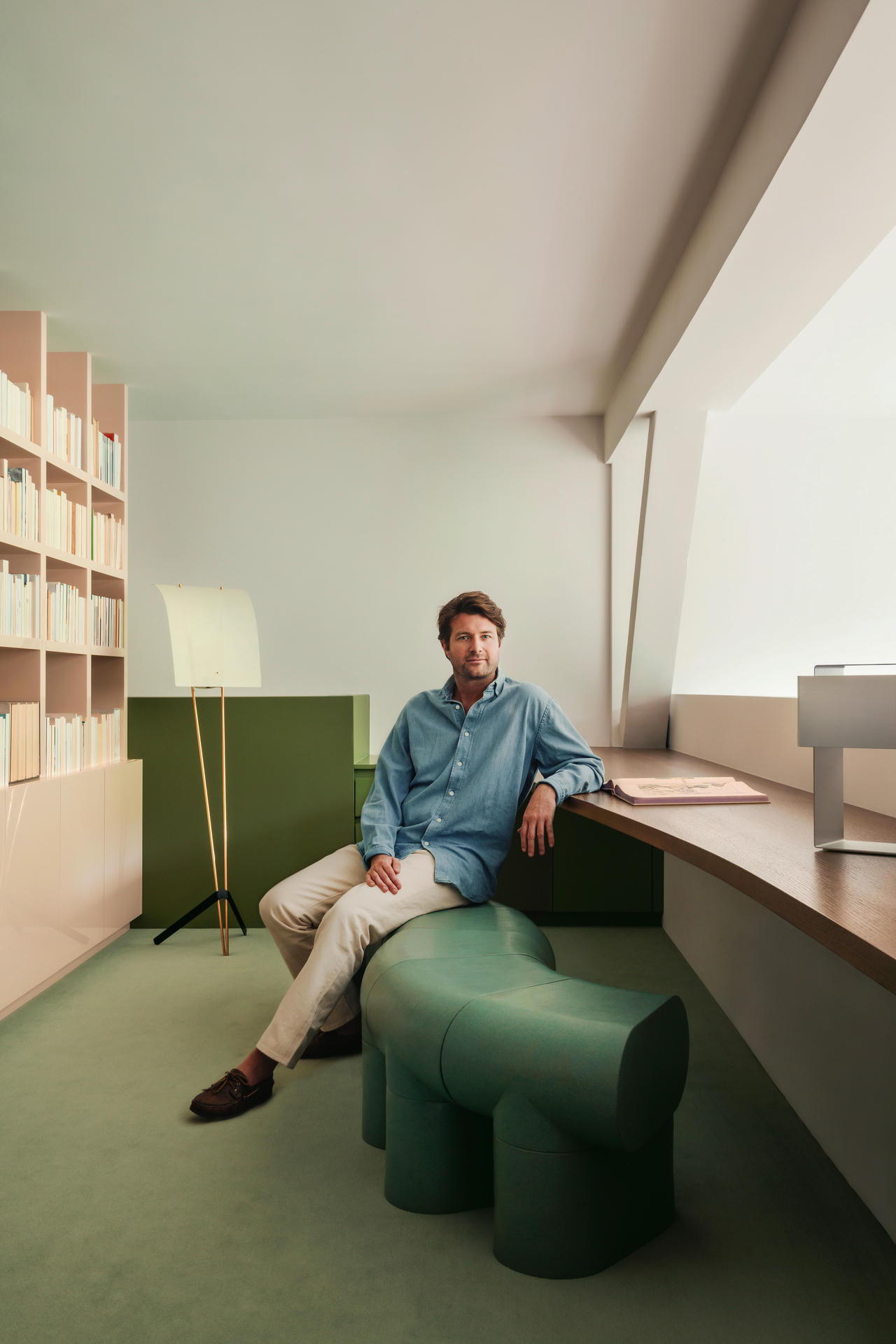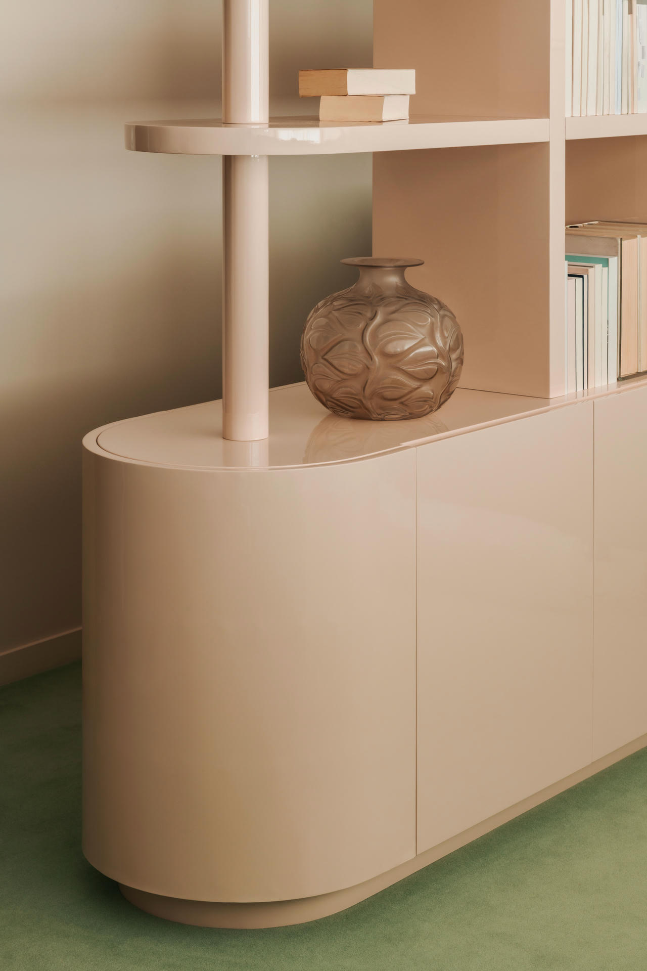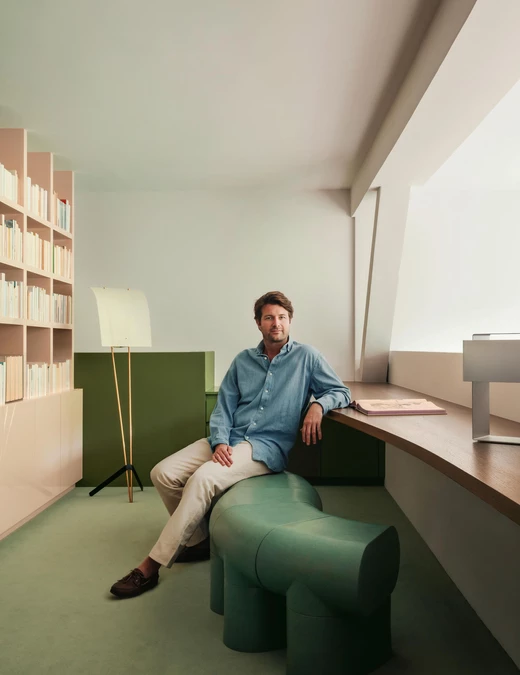 Biurko ustawione wzdłuż balustrady pozwala korzystać z widoku na wysokie okna i wizualnie niweluje kameralną skalę, a towarzysząca mu ceramiczna ławka Rina Claessensa oraz lampa podłogowa Pierre’a Guariche’a dopełniają kompozycję. Krzywizny i subtelny odcień różu wprowadzono, by złagodzić geometrię wnętrza.