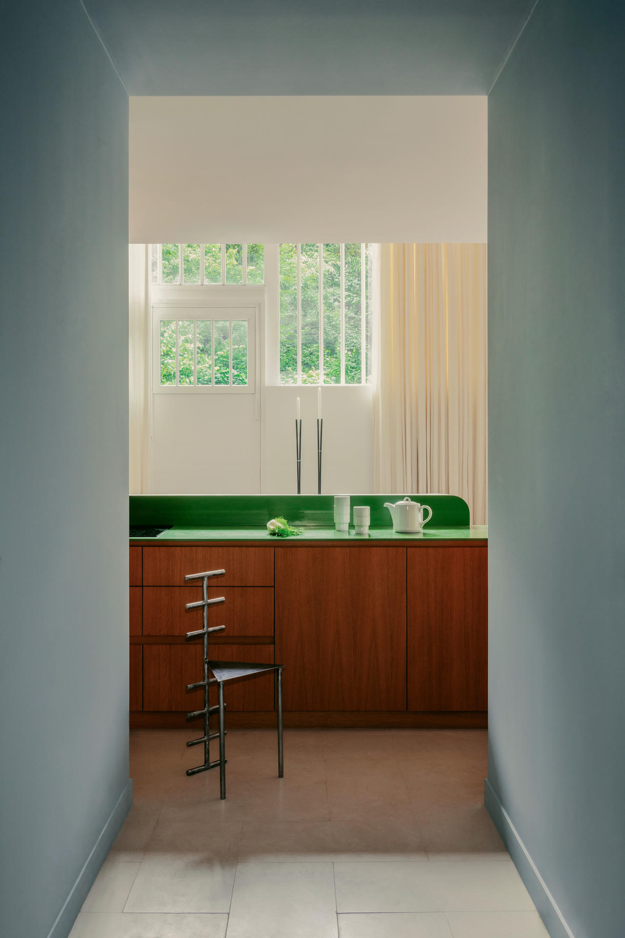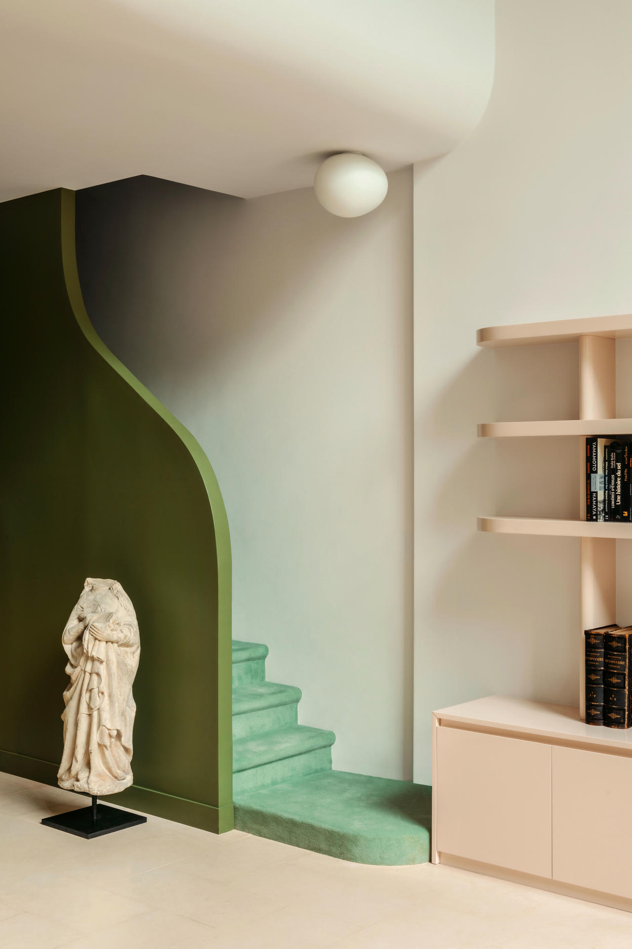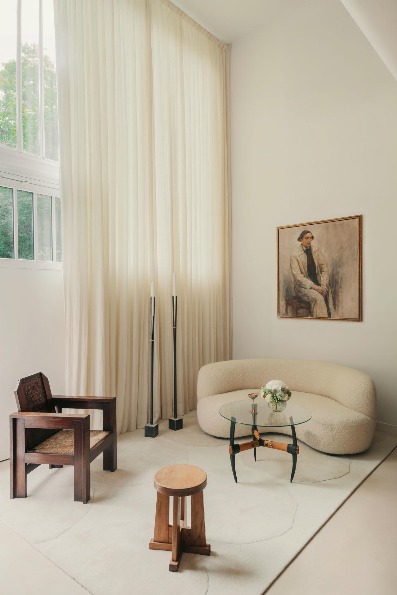 Mieszkanie zajmuje dwa poziomy w dwurodzinnym budynku zaprojektowanym przez Pierre’a Patouta i mieści się w dawnej przestrzeni atelier. Przez lata pracowali tu artyści, a monumentalne okna wychodzące na zieleń dawnej linii kolejowej zapewniały idealne warunki do pracy twórczej. Nowa właścicielka, związana zawodowo z branżą luksusową, chciała zachować ten klimat, jednocześnie przekształcając wnętrze w nieco bardziej funkcjonalną przestrzeń.