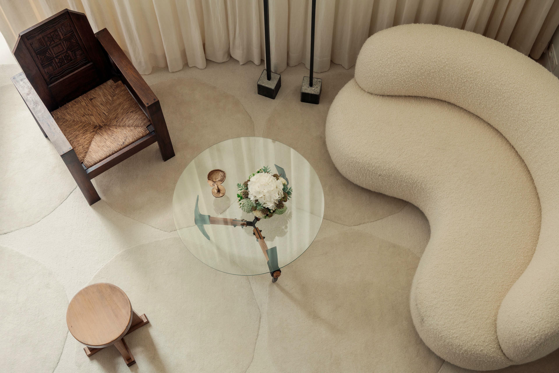 Martin Massé potraktował projekt jako współczesną realizację zakorzenioną w duchu art déco i wczesnego modernizmu. Koncepcję oparto na idei polichromii architektonicznej Le Corbusiera. Salon – będący granicą między wnętrzem a zewnętrzem – utrzymano w jasnej, powściągliwej tonacji, aby umożliwić swobodny przepływ światła. Niemal biała posadzka z portugalskiego kamienia, czyste ściany oraz kremowa, lakierowana biblioteka o miękkich liniach inspirowanych Eugène’em Printzem budują spokojną, świetlistą atmosferę.