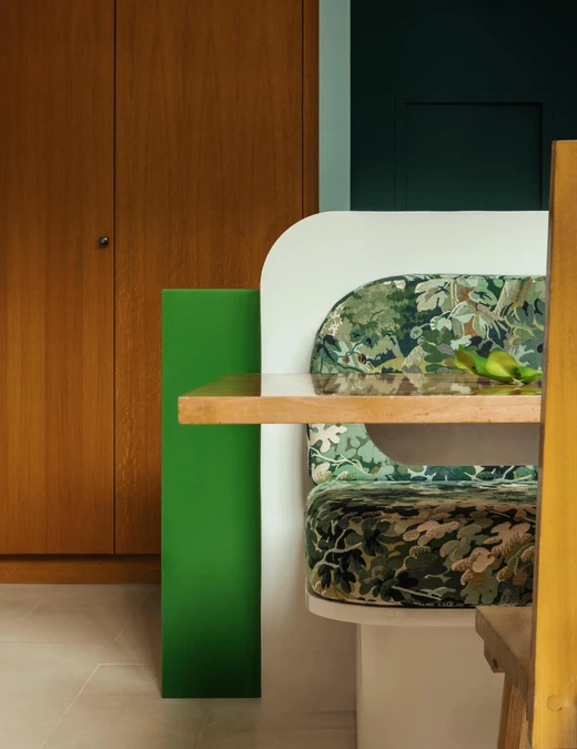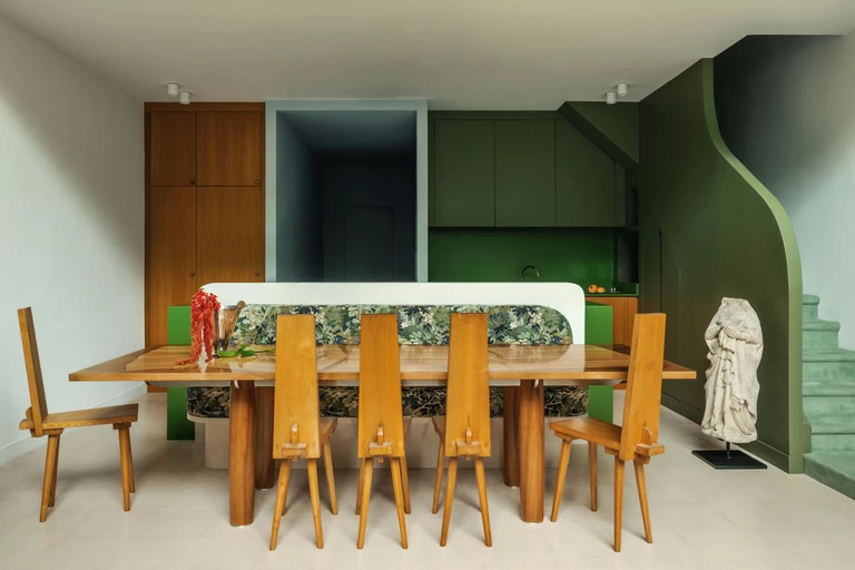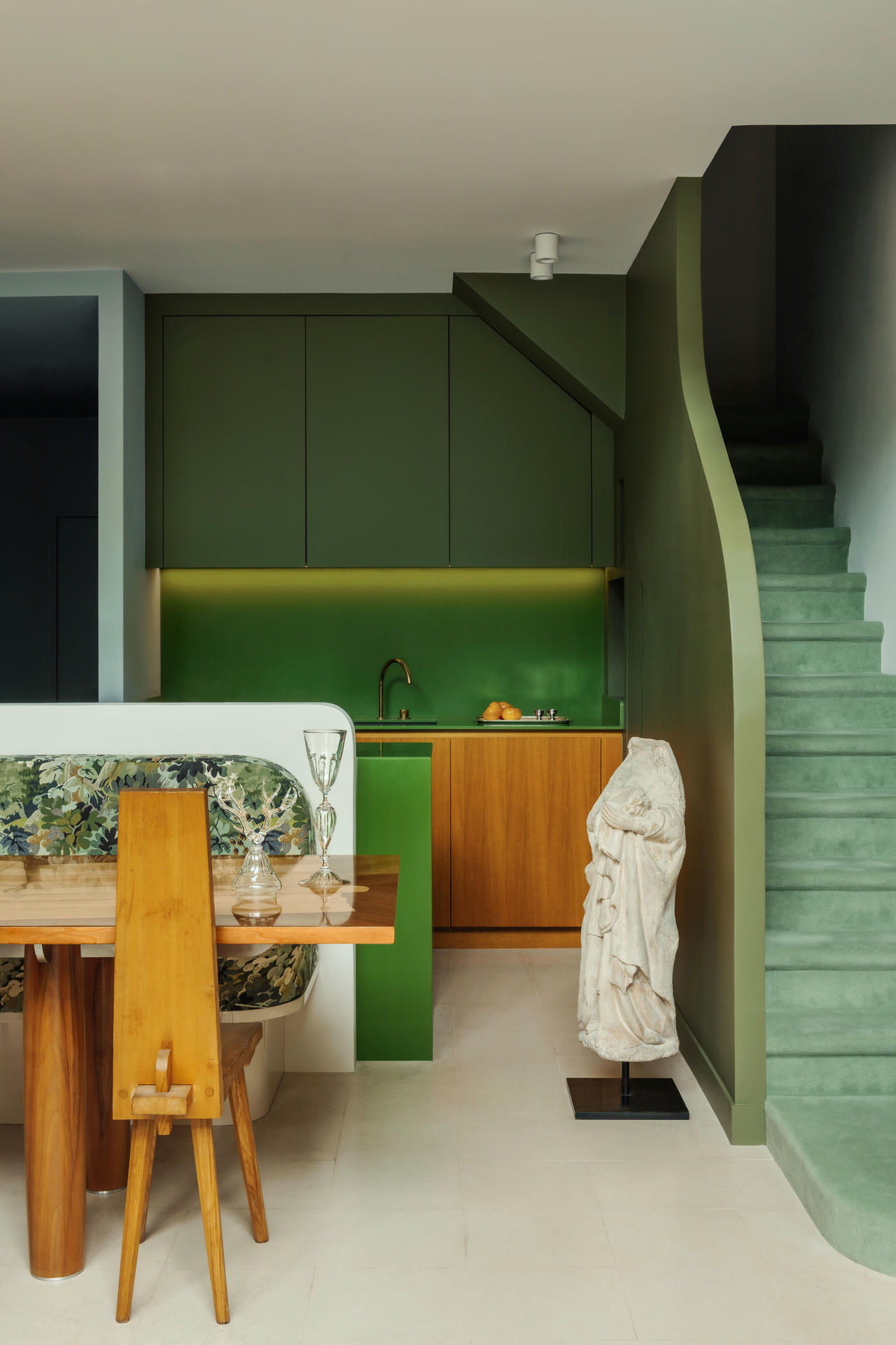 Warstwy materiałów i kolorów przenikają się: wyspa w intensywnym odcieniu zieleni, zabudowa z bejcowanego dębu w ciepłym tonie, zielone powierzchnie oraz elementy, które płynnie przechodzą w falującą balustradę schodów. Błękitna wnęka akcentuje strefę wejścia.