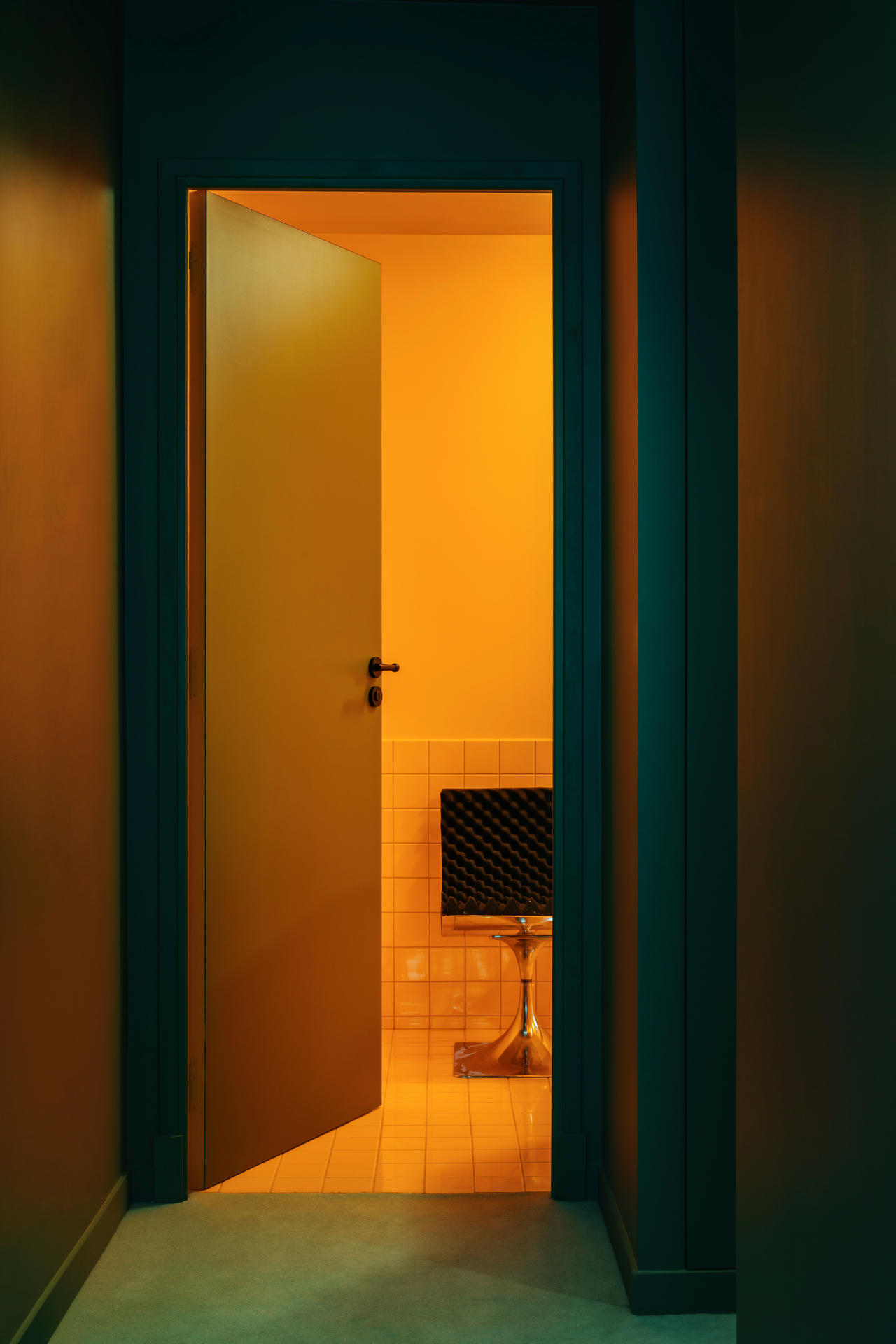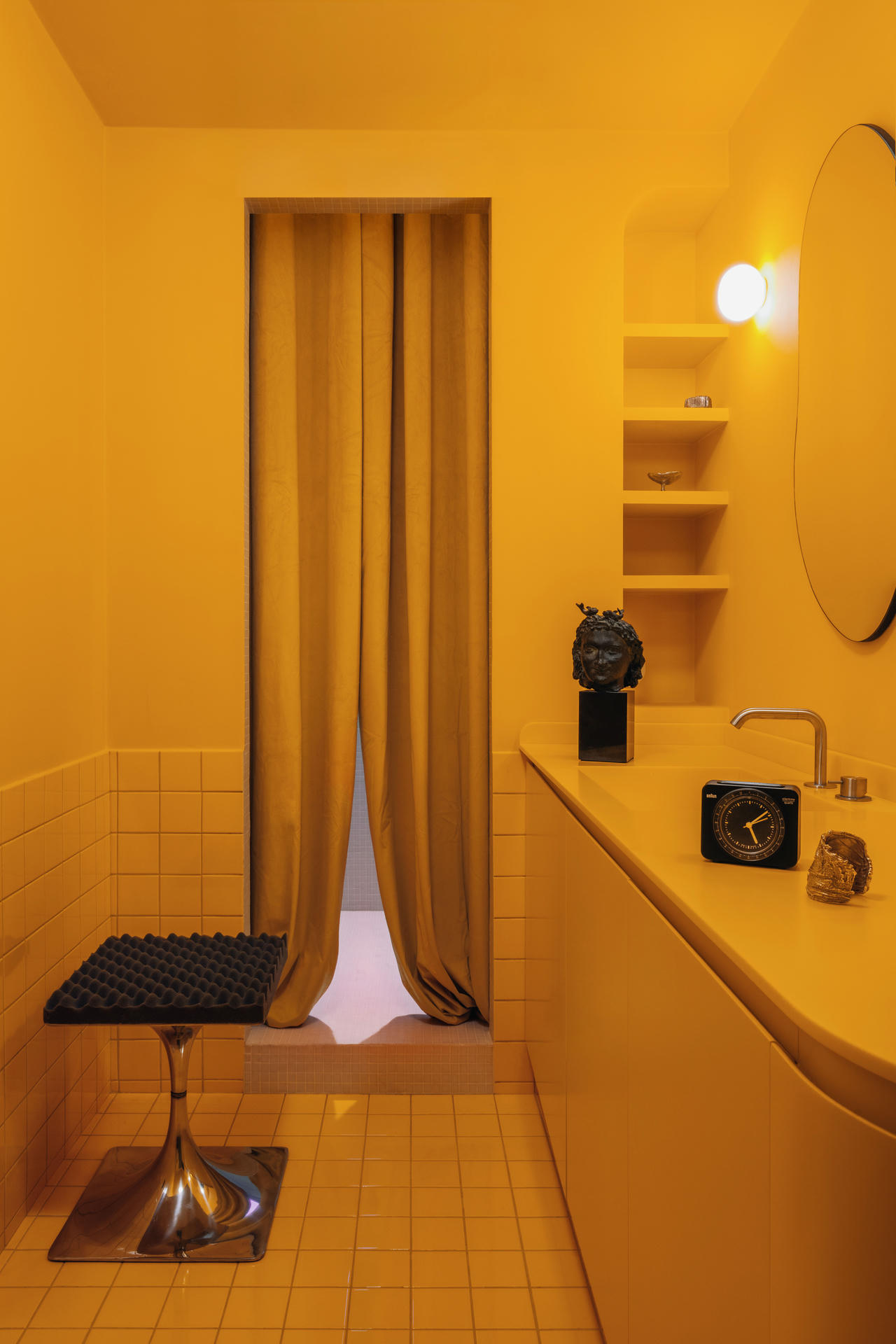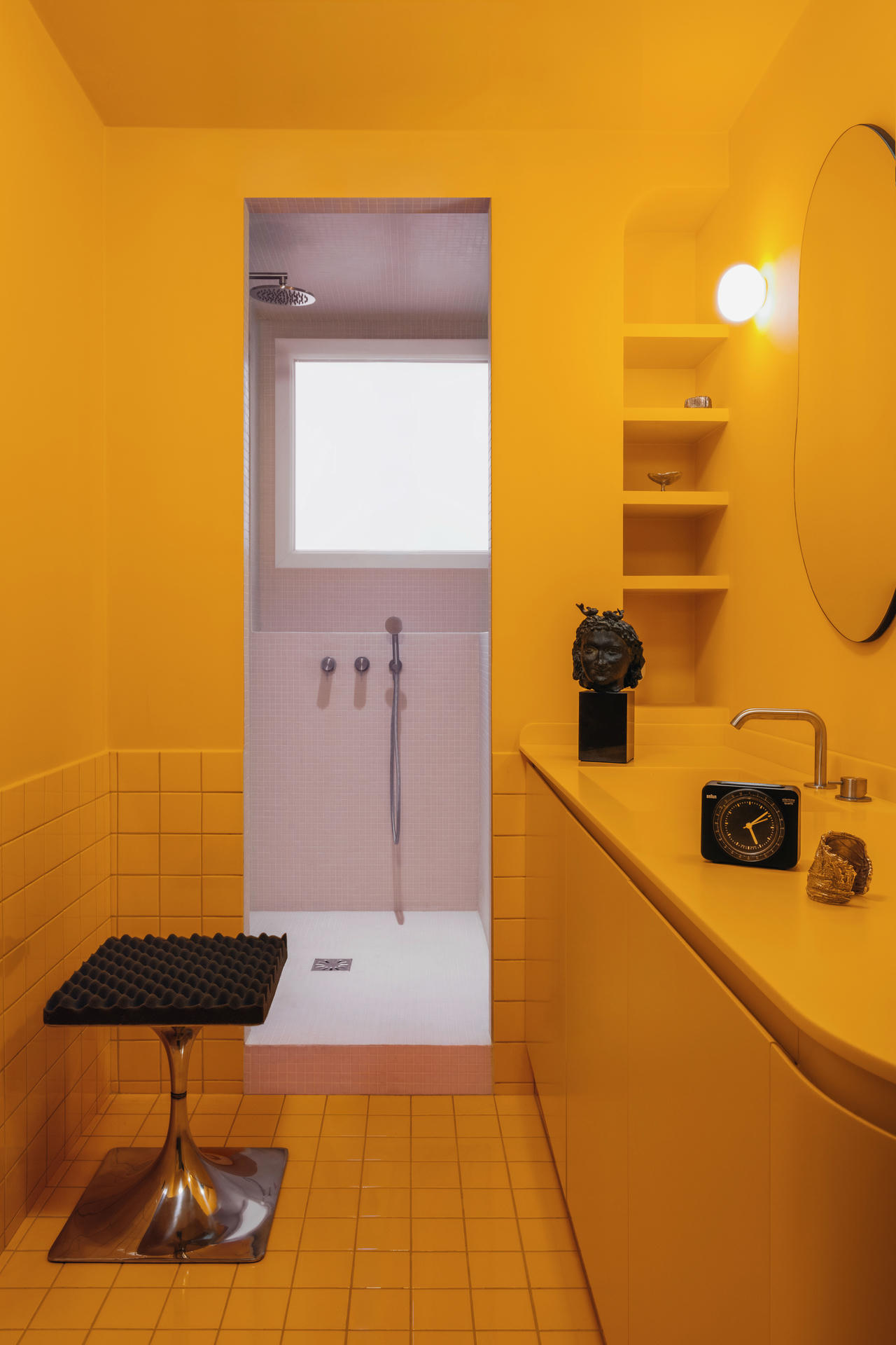 Garderoba prowadząca do łazienki kontynuuje głębokie zielone tonacje obecne w kuchni. Sama łazienka została utrzymana w monochromatycznej kolorystyce żółci – błyszczące płytki pokrywają ściany, sufit i podłogę, a zabudowa i umywalka tworzą spójną całość. W prysznicu pojawia się jasnoróżowa mozaika, łagodząca intensywność tej przestrzeni.