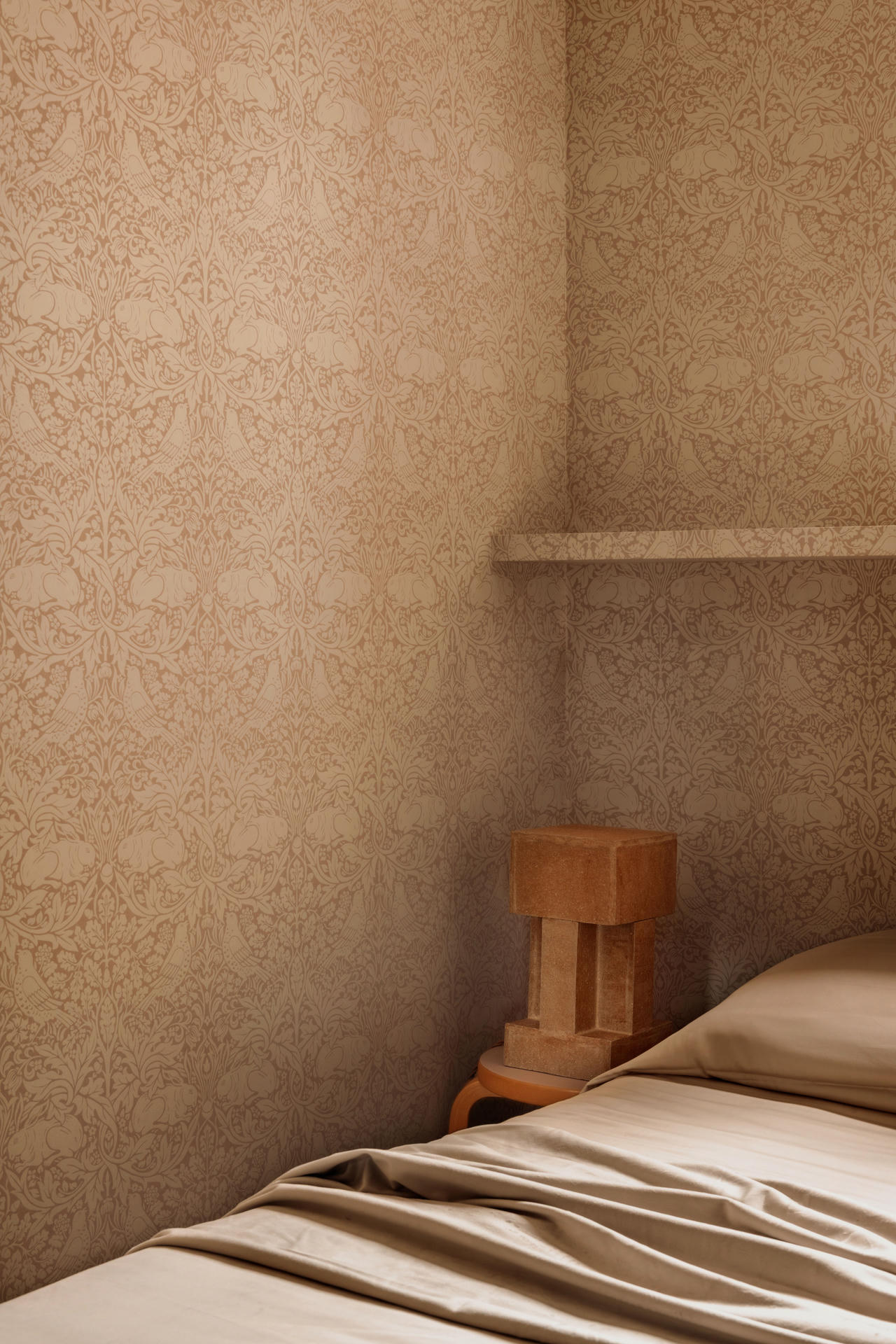 Sypialnia stanowi natomiast świadomy kontrast wobec reszty projektu. Potraktowana jako autonomiczna przestrzeń, nawiązuje do intymnego, kobiecego świata końca XIX wieku – z tapetą Morris & Co o florystycznym wzorze charakterystycznym dla secesji.