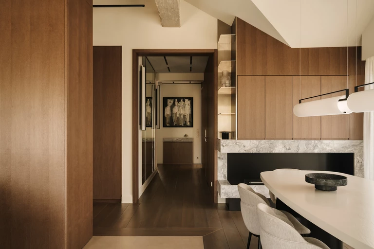 W palecie kolorystycznej projektu dominują odcienie taupe i oliwki. Zróżnicowanie poszczególnych przestrzeni wynika z zastosowania minimalistycznych detali i nieoczywistych rozwiązań, takich jak podziały na okładzinach ściennych czy łączenie kamienia z fornirem i stalą. W projekcie nie zabrakło unikatowej selekcji lamp. Połączono ikoniczne wzory, takie jak Flos Frisbi, Vibia Kontur, Lee Broom Eclipse, z nowymi i bardziej niszowymi modelami, jak Audo Hashira czy projekty Toma Rossau. Wnętrze dopełniły obrazy i rzeźby.