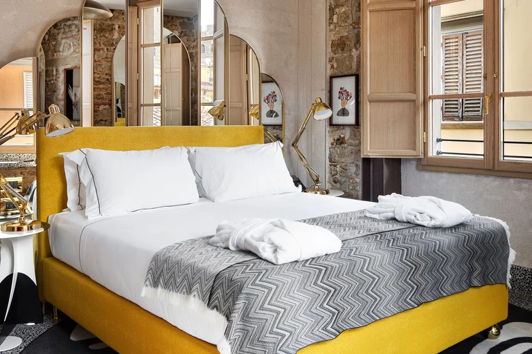 Choć w łazienkach znajdziemy klasyczną mozaikę, ułożono ją w dość szalony nowoczesny wzór. Łóżko zdobią ogromne wezgłowia wykonane z luster. Żółty kolor idealnie równoważony jest czerwienią, a wszechobecny marmur dodaje szyku.