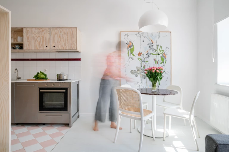 Nieszablonowe rozwiązania przestrzenne dopełnia gra tekstur. Zabudowa kuchenna wykonana została ze stali i sklejki iglastej, blat stołu i szafki w łazience to przepiękny marmur Rosso Levanto, a ściany jednego przedpokoju zdobi tapeta w kwiatowe wzory. Surowość materiałów została przełamana paletą kolorów, w tym różem i błękitem.