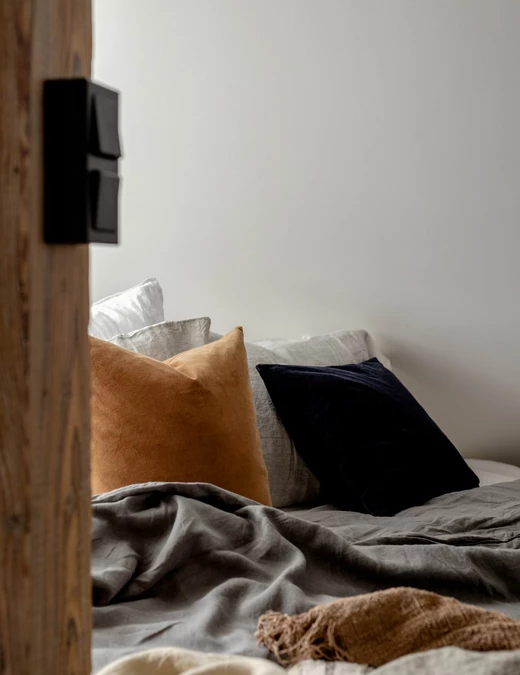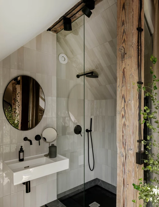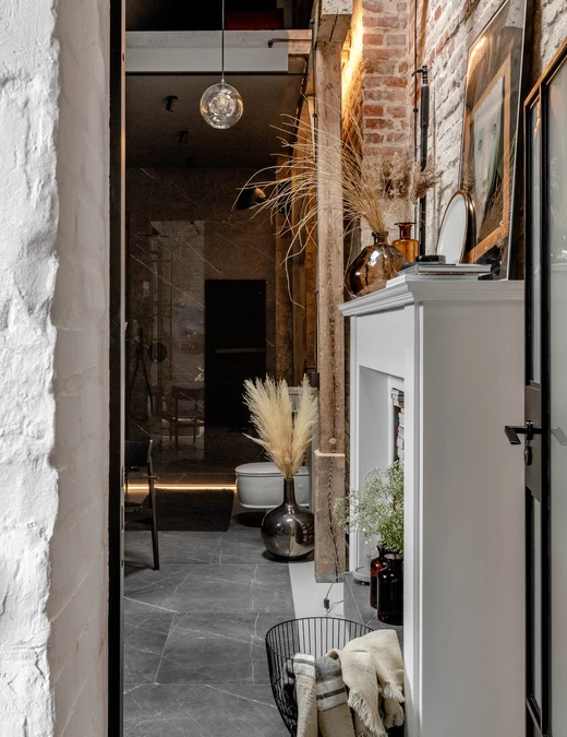 Wprowadzono tu współczesne elementy: ogrzewanie podłogowe, dizajnerskie meble, nowoczesną armaturę w łazience. Jednocześnie zachowano historyczne elementy dawnej suszarni: odkrytą, surową cegłę i drewniane belki konstrukcyjne, które wkomponowano w nową aranżację. Całość jest niezwykle spójna.