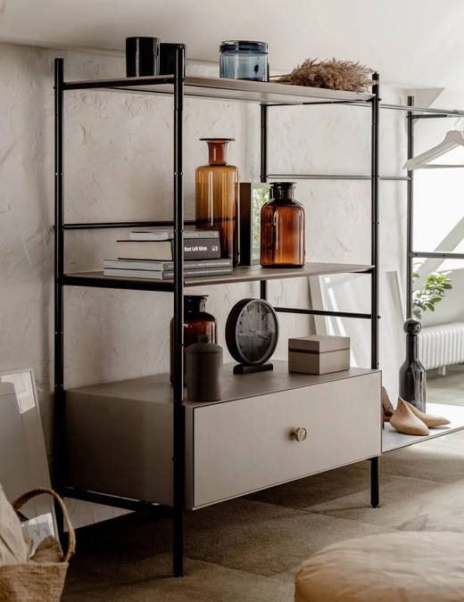 Posadzki zdobi antracytowy kamień z białą żyłką. Jego ciężar stanowi świetne tło dla lekkiej zabudowy systemowej MODULLA. Stalowe rurki, z których wykonano meble, dobrze komponują się też z natynkowym okablowaniem i żeliwnymi grzejnikami. Obecność zielonych roślin, naturalne dodatki ze sklepu Nap i ciepłe kolory tworzą przyjazny klimat. Na ścianie zawisł gościnnie obraz Grażyny Smalej - alef. Jest minimalistycznie, a jednocześnie przytulnie. Jasno i eklektycznie.