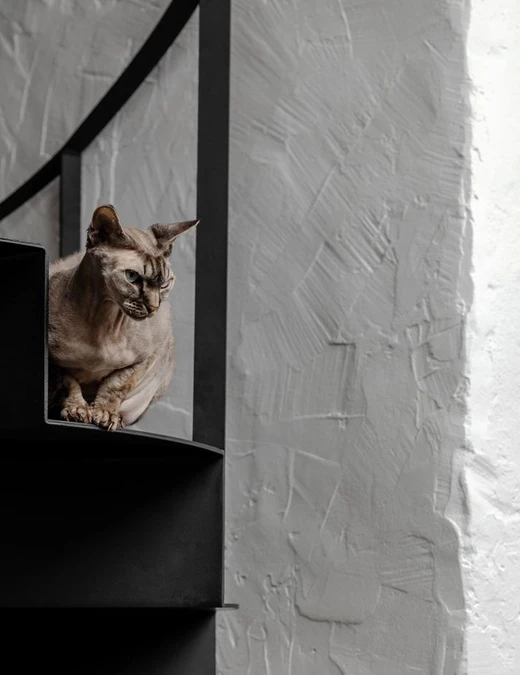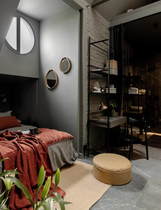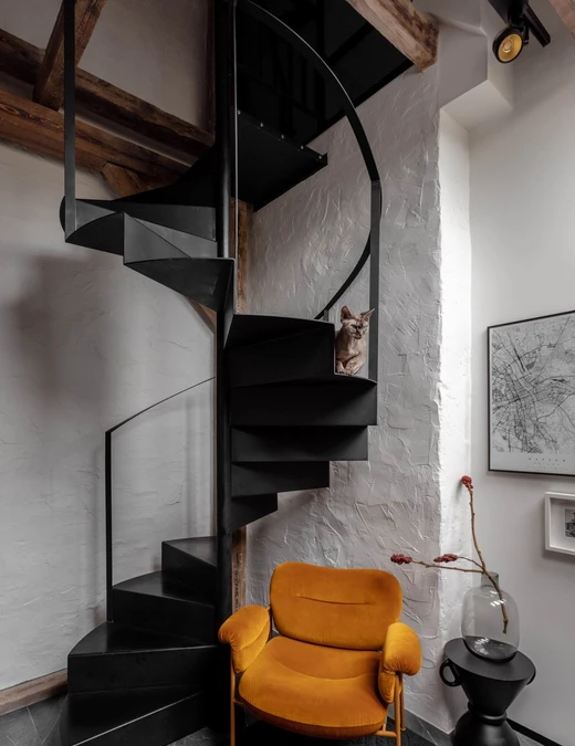 Mieszkanie jest funkcjonalnie podzielone na dwa poziomy. Na piętrze, do którego prowadzą spiralne schody, ukryto dodatkową sypialnię z łazienką. Część ścian wyburzono i zastąpiono je przeszkleniem z widokiem na wnętrze wieży.