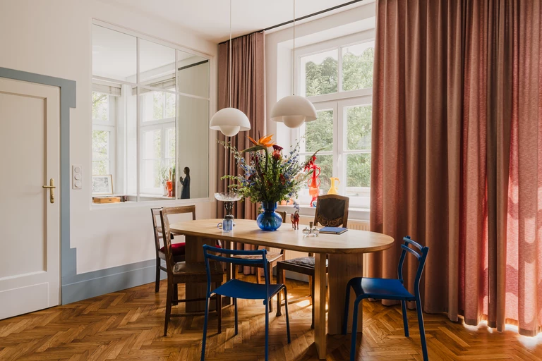 Mając to na uwadze, architekci zdecydowali o odświeżeniu drewnianych drzwi z rzeźbionymi ościeżnicami i ich kolorystyczne dopasowanie do koncepcji każdego z pomieszczeń. Oryginalny parkiet w salonie poddano renowacji, w holu jednak zdecydowano się na zerwanie desek i zastosowanie kontrastującej granatowej posadzki.
