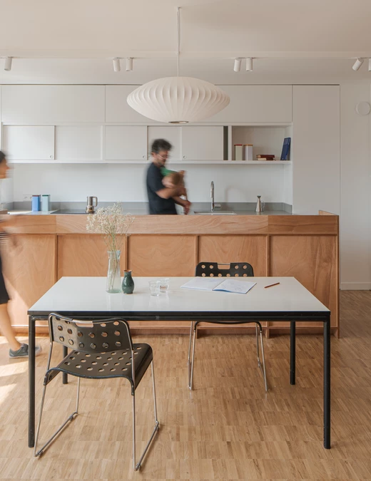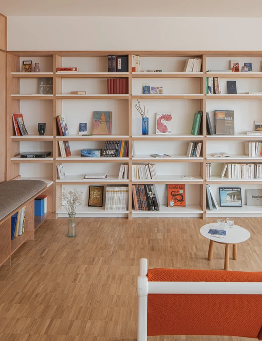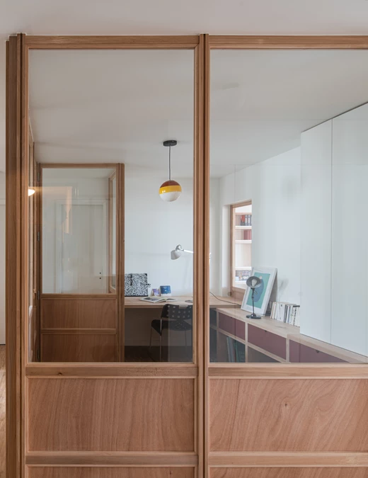 Francuska pracownia Atelier Boteko w swoich realizacjach lubi posługiwać się prostym i czytelnym językiem wizualnym. Nie inaczej jest we wnętrzu tego paryskiego mieszkania. Podstawowym założeniem projektowym była zmiana układu wnętrza na bardziej funkcjonalny. Na nowym planie część dzienną od prywatnej oddzielił kubik, w którym mieści się domowe biuro. Jego ściany są niemal w pełni przeszklone, tak aby zapewnić dostęp do jak największej ilości dziennego światła. Jedna ze ścian w strefie dziennej, przyległa do części biurowej, kryje w sobie pojemne szafy. Tuż pod „biurowym” oknem zaaranżowano ławkę z regałem i schowkami.