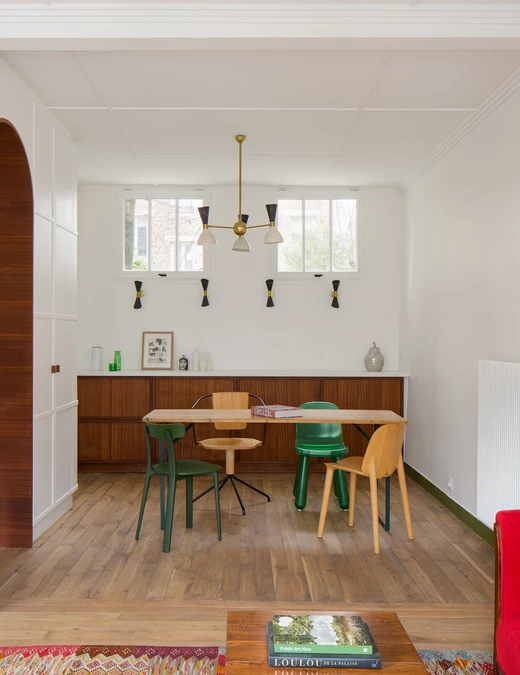 Za metamorfozę wnętrz tej paryskiej rezydencji odpowiada studio Atelier Pierre Louis Gerlier. XIX-wieczny dom został przemieniony w nowoczesną willę dla współczesnej rodziny. W niemal całym domu króluje kolor zielony: od oliwki w salonie, przez zieleń na schodach, aż po wpadające w szmaragd kafelki w kuchni. Jej idealnym dopełnieniem jest biel oraz niemal wszechobecne drewno, które wprowadziło do wnętrza przytulny charakter.