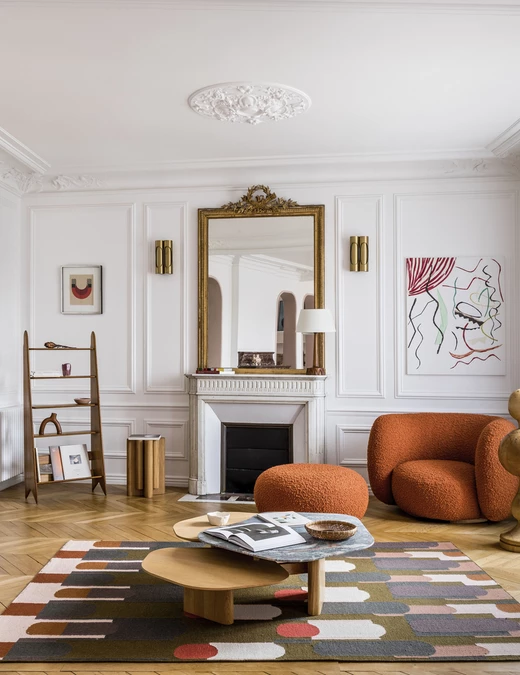 Ten apartament znajduje się w haussmanowskiej kamienicy, położonej w 7. dzielnicy Paryża. Za projekt jego wnętrza odpowiada Batiik Studio. Wykreowana przez projektantów przestrzeń wyróżnia się energetyzującą kompozycją kolorów oraz form. Znalazły się tu liczne meble na wymiar, w tym stół jadalniany oraz regał. Oryginalny, pomarańczowy zestaw mebli w postaci fotela i pufy w salonie zaprojektował Emmanuel Outy, zaś stół w kuchni stworzył Max Cobalto. Z zabytkowych mebli można tu dostrzec regał z litego dębu Pierre’a Cruège’a, drewniane krzesła Nielsa Otto Møllera w salonie oraz krzesło „Tube” w kuchni, zaprojektowane w 1951 roku przez Mathieu Mathégota. Obiekty świetnie korespondują z licznymi grafikami, obrazami i rzeźbami.