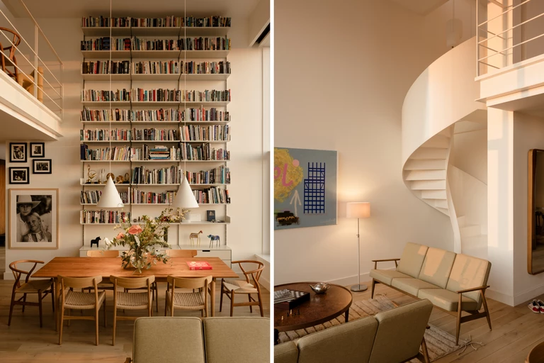 Wnętrze czerpie inspirację z estetyki lat 60. – w salonie centralnym punktem jest zestaw stołu i krzeseł Carla Hansen & Son, a polski akcent wprowadzają sofy od 366 Concept. Całość dopełniają eleganckie lampy Watsberg, nadając przestrzeni przytulny, a zarazem wyrafinowany charakter. Sercem części dziennej jest wypełniony książkami regał marki Vitsoe, sięgający sufitu. Wzrok przyciągają również rzeźbiarskie, zaokrąglone schody, prowadzące na antresolę.