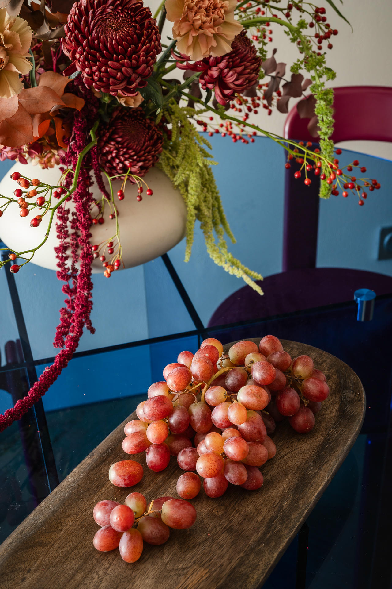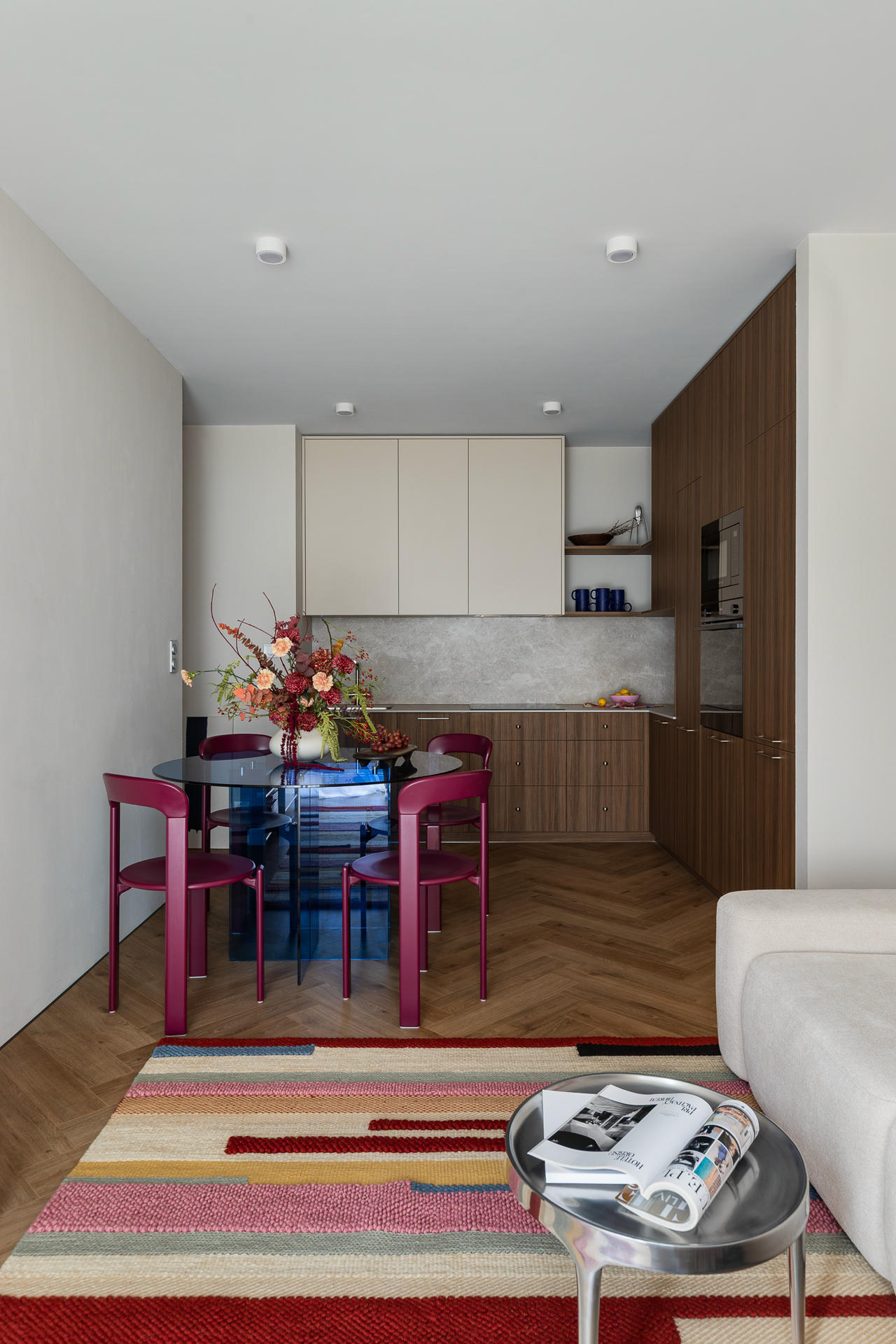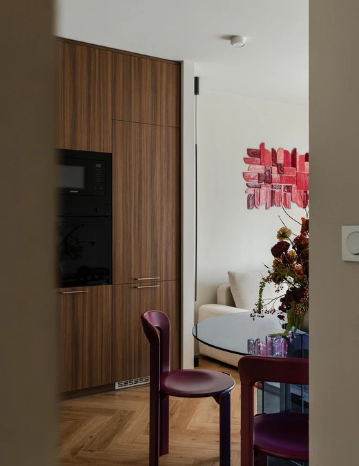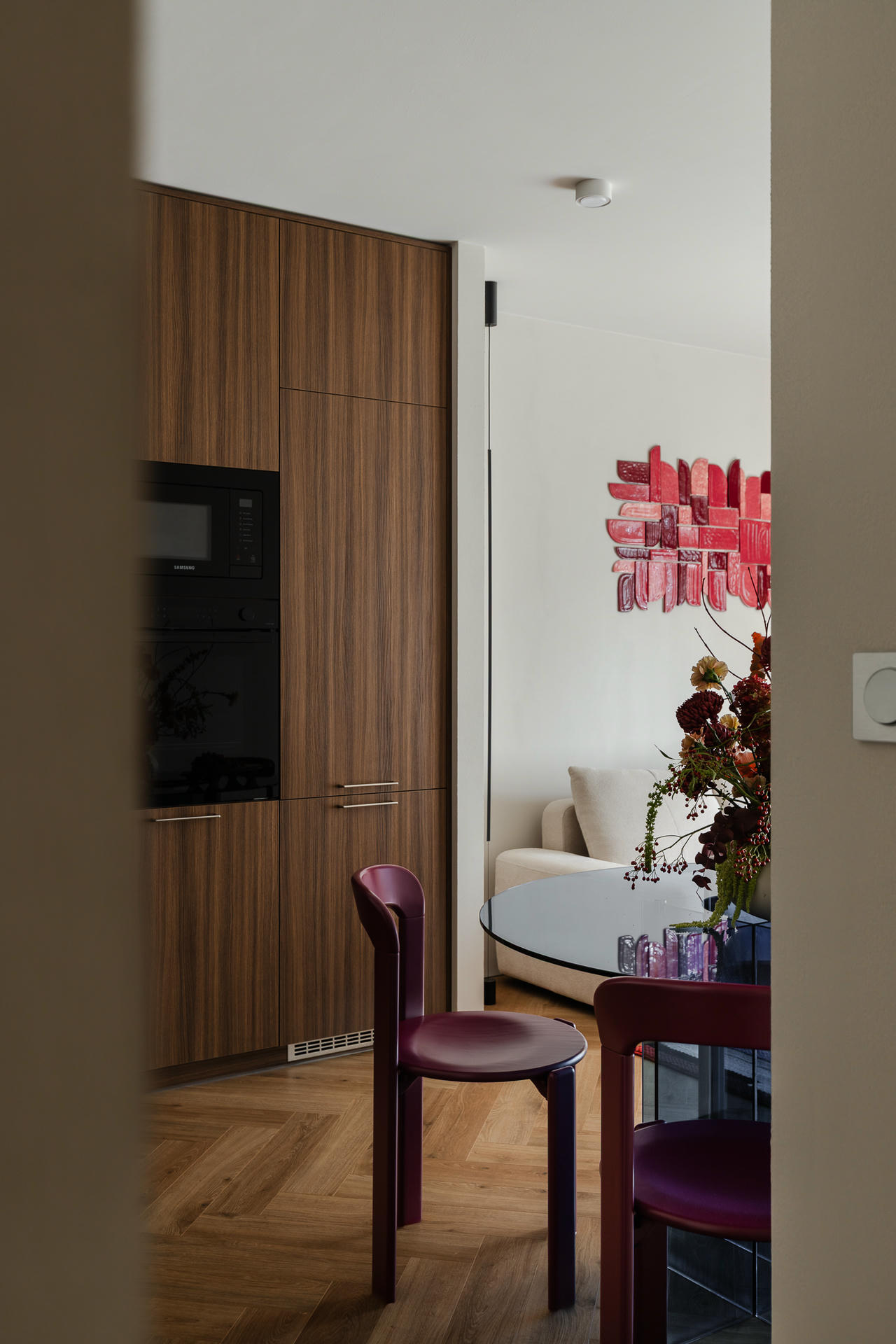Na spokojnym tle mają szansę wybrzmieć kolory i sztuka. W części dziennej uwagę przyciąga okrągły stół z transparentnym, granatowym blatem oraz bordowe krzesła, które nadają ton całemu wnętrzu. Nad sofą zawisła wykonana na zamówienie kompozycja z glinianych płytek – praca klientki 032 Atelier z poprzedniego projektu.