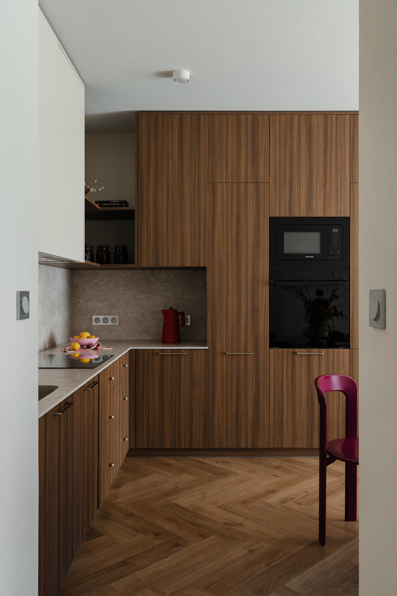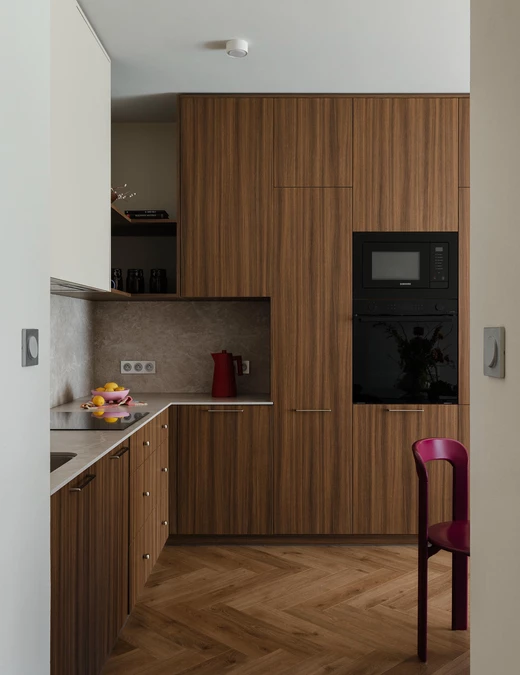 Zabudowa kuchenna, szafa w korytarzu i meble łazienkowe powstały według autorskich rysunków pracowni i zostały wykonane przez stolarza. Kuchnia, choć wizualnie lekka, oferuje dużo miejsca do przechowywania, dzięki czemu reszta mieszkania pozostaje wolna od ciężkich brył.