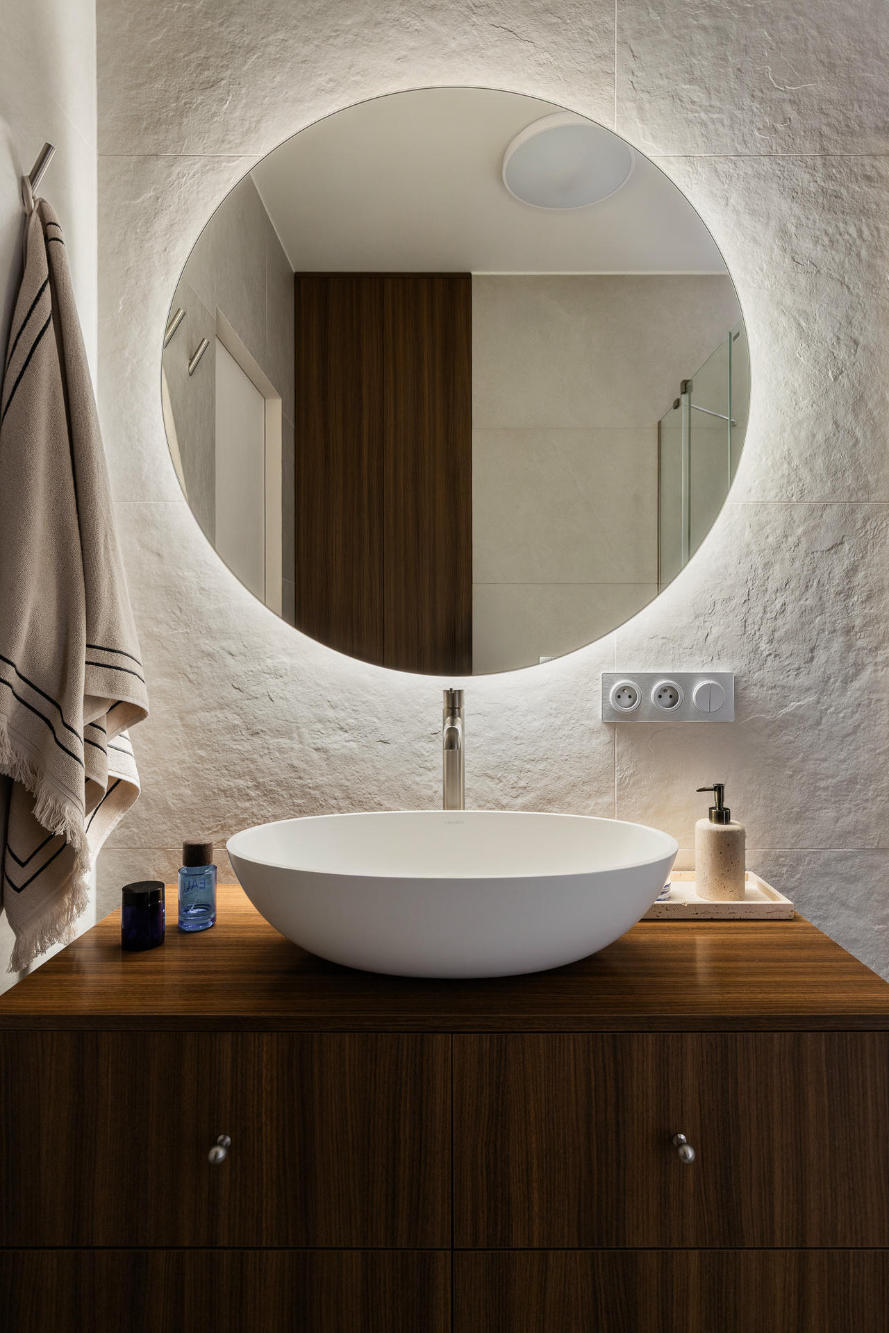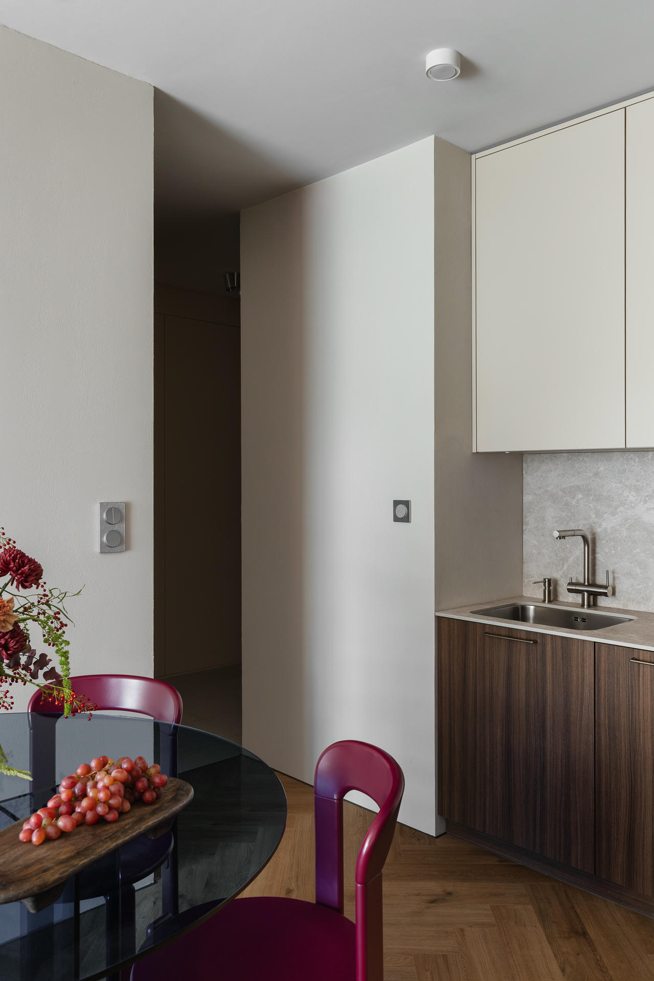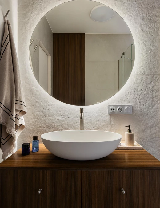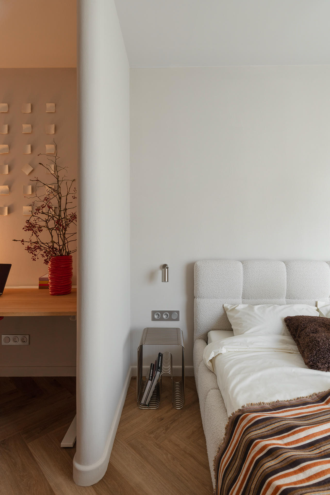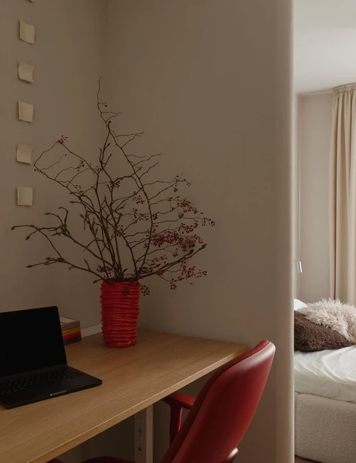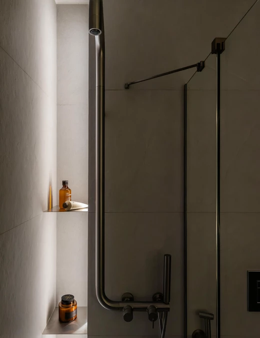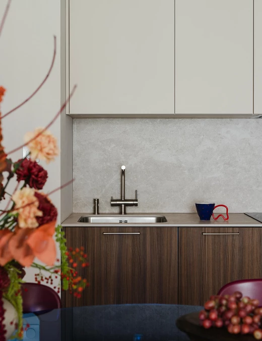 Punktem wyjścia stała się ponadczasowa, neutralna baza, uzupełniona o odważniejsze kolory i formy. Projektanci postawili na ciepłą, piaskową paletę i wyraziste faktury. Wszystkie ściany pokryto dekoracyjną szpachlą Kabric od Flugger – ale mieszając dwa odcienie, aby uzyskać idealny kolor. Matowa, lekko nieregularna powierzchnia daje efekt naturalnej niedoskonałości i sprawia, że przestrzeń wydaje się zapraszać do sensorycznych doświadczeń.