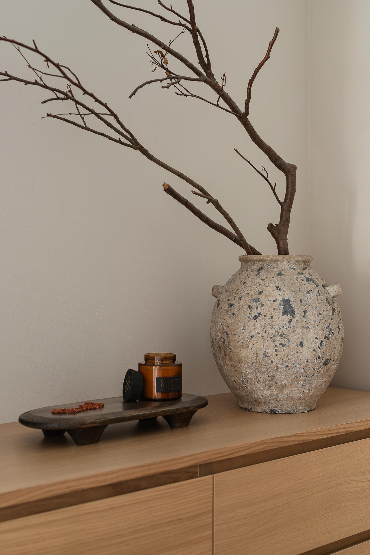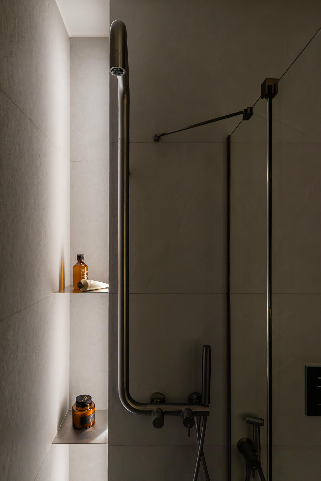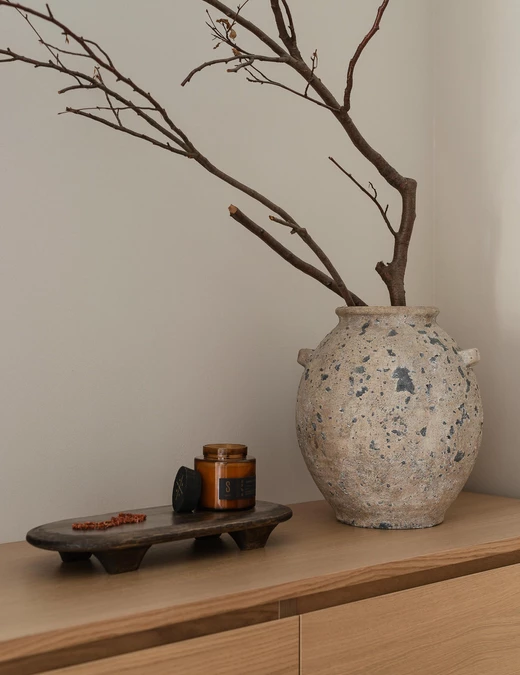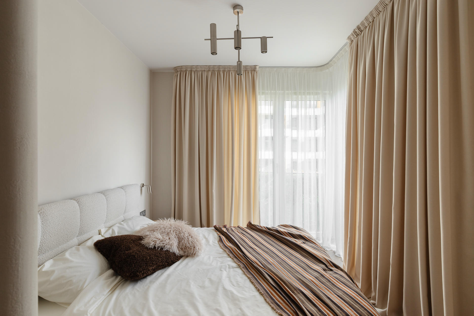Punktem wyjścia stała się ponadczasowa, neutralna baza, uzupełniona o odważniejsze kolory i formy. Projektanci postawili na ciepłą, piaskową paletę i wyraziste faktury. Wszystkie ściany pokryto dekoracyjną szpachlą Kabric od Flugger – ale mieszając dwa odcienie, aby uzyskać idealny kolor. Matowa, lekko nieregularna powierzchnia daje efekt naturalnej niedoskonałości i sprawia, że przestrzeń wydaje się zapraszać do sensorycznych doświadczeń.