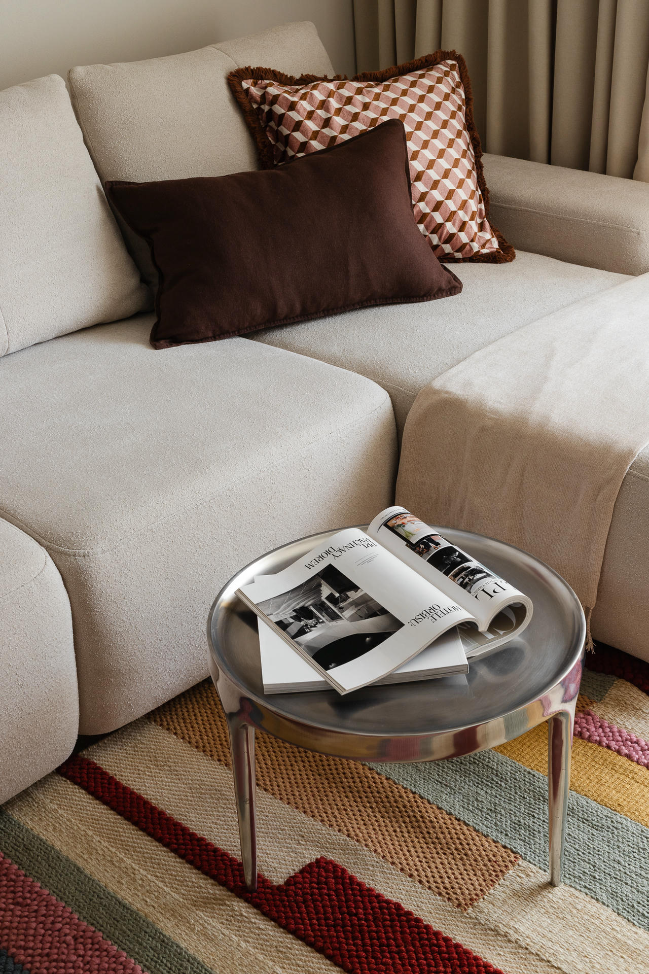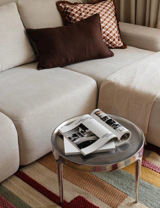 Mieszkanie opiera się na subtelnych kontrastach. Obok stalowego stolika kawowego pojawia się tkany dywan, a futurystyczny wyciskacz Juicy Salif stoi tuż obok tradycyjnych, glinianych naczyń. Wyposażenie jest świadomą mieszanką – od mebli z popularnych sieciówek po elementy marek takich jak HAY czy 101 Copenhagen, uzupełnione o ceramikę i autorskie dekoracje.