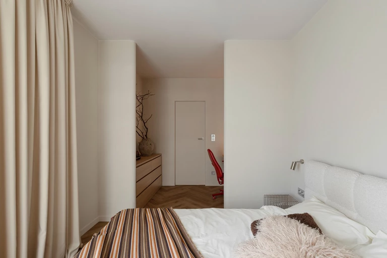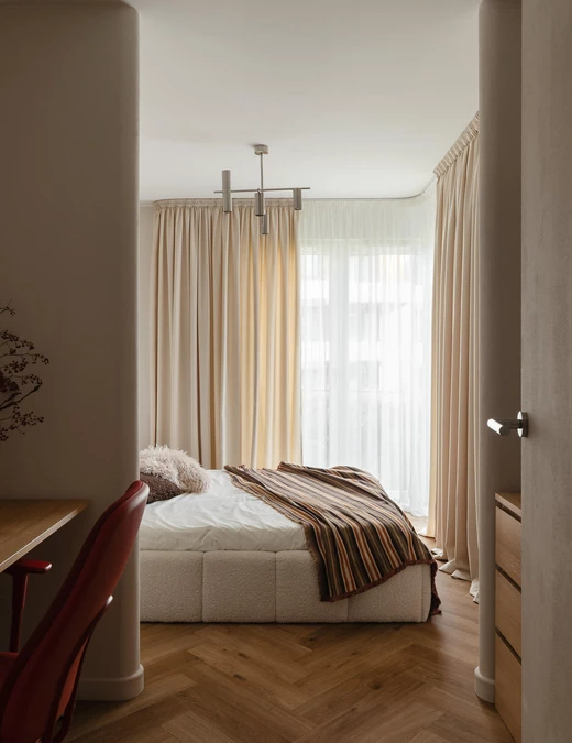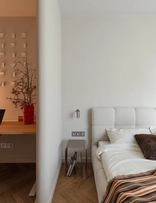 Największym wyzwaniem okazał się metraż. Na 46 m² miały zmieścić się liczne schowki i pełnoprawne miejsce do pracy. W sypialni projektanci dodali dwie ściany z zaokrąglonymi narożnikami, które subtelnie podzieliły pomieszczenie na część do spania oraz kameralny kącik z biurkiem. Dzięki temu przestrzeń zyskała dodatkową funkcję i nie straciła wizualnej lekkości.