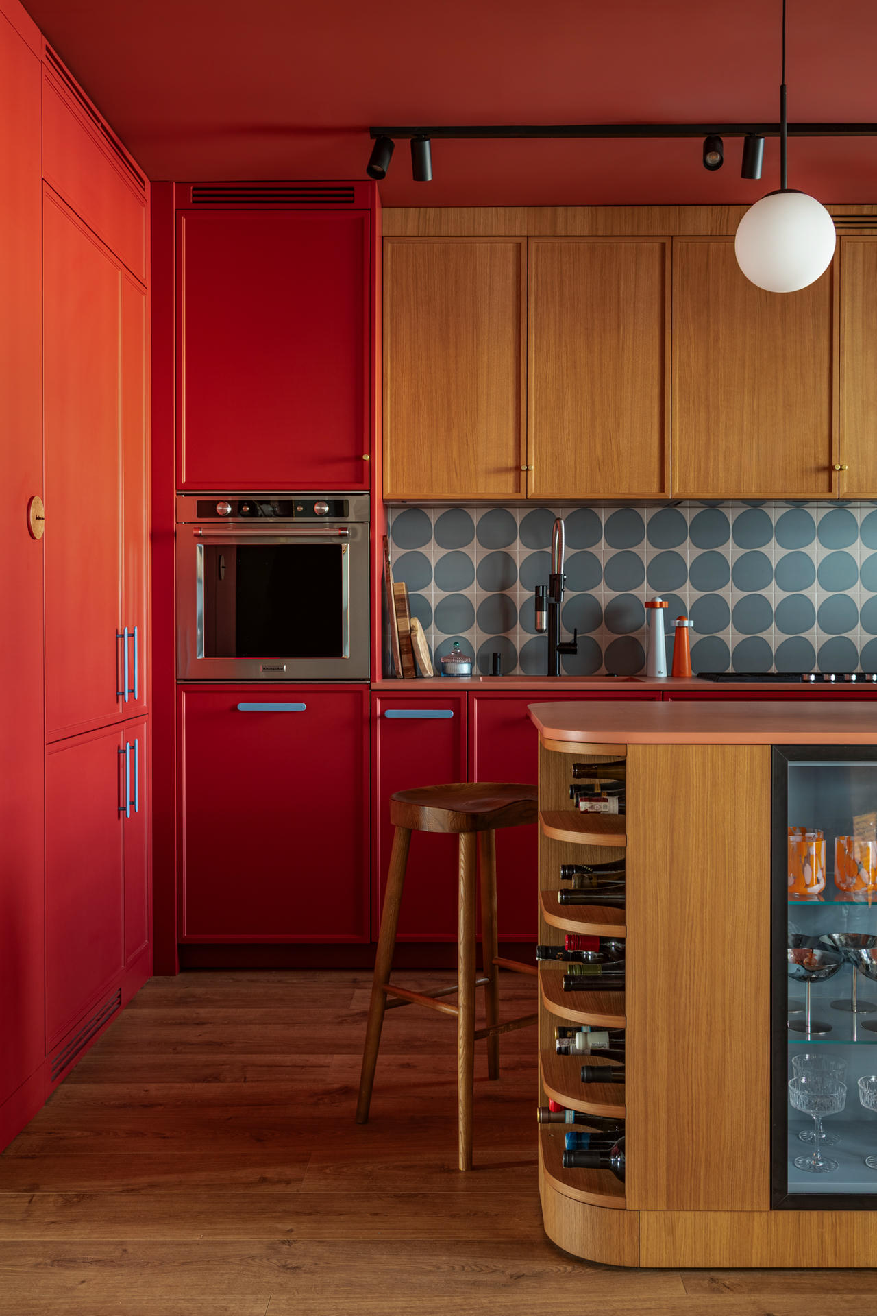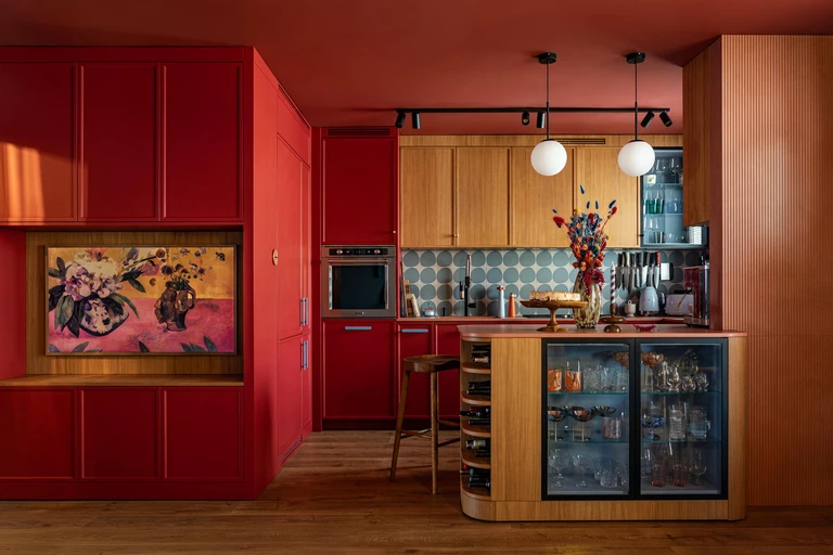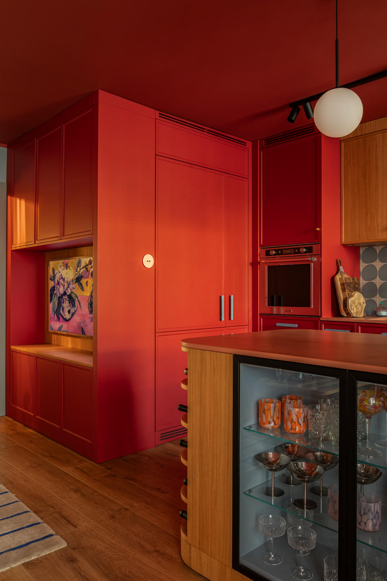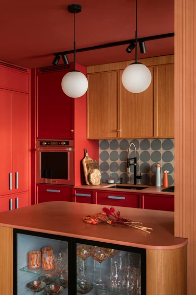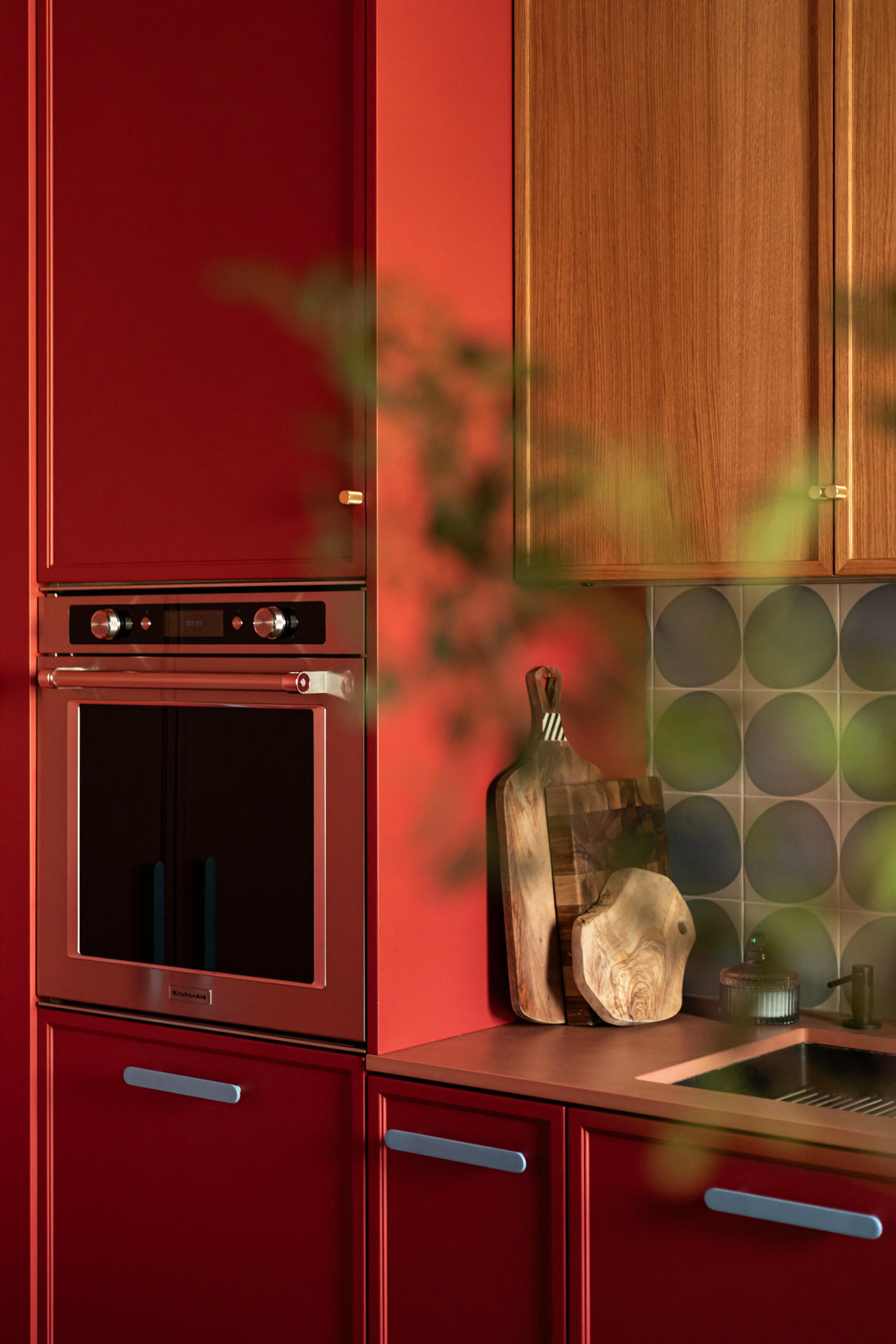 Najmocniejszym akcentem są czerwone, lakierowane fronty w frezowanej ramce – głębokie, nasycone, przyciągające uwagę. Jednak zachowano równowagę i intensywny kolor został złagodzony przez fornirowane fronty dębowe, które wprowadzają naturalną nutę.