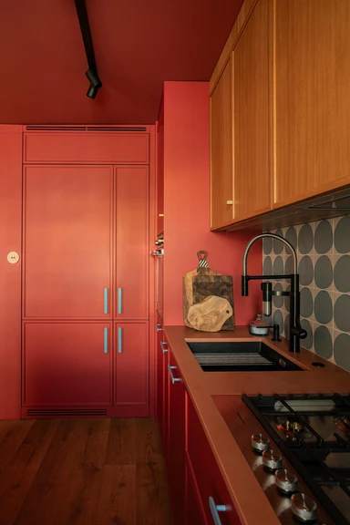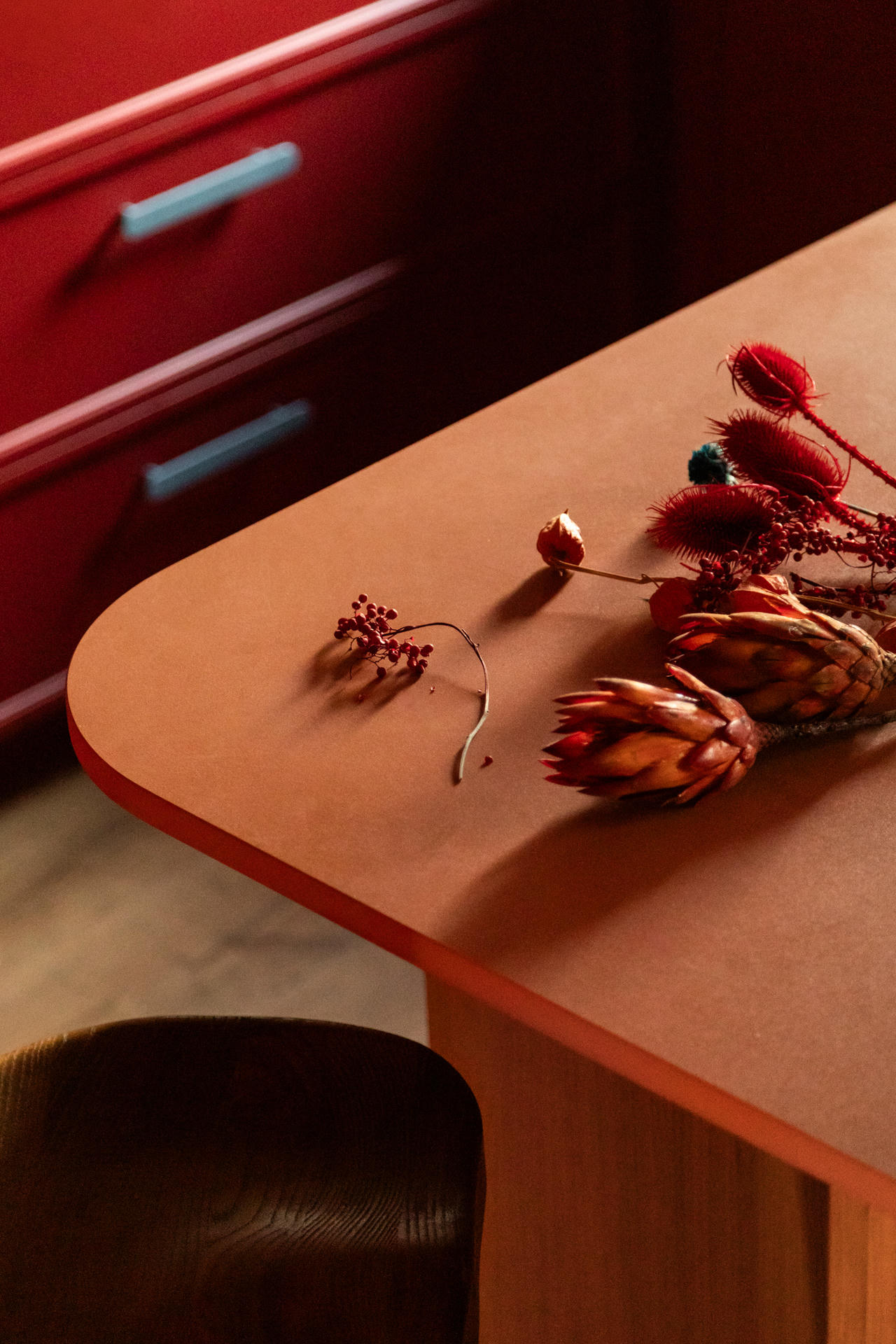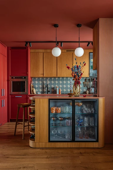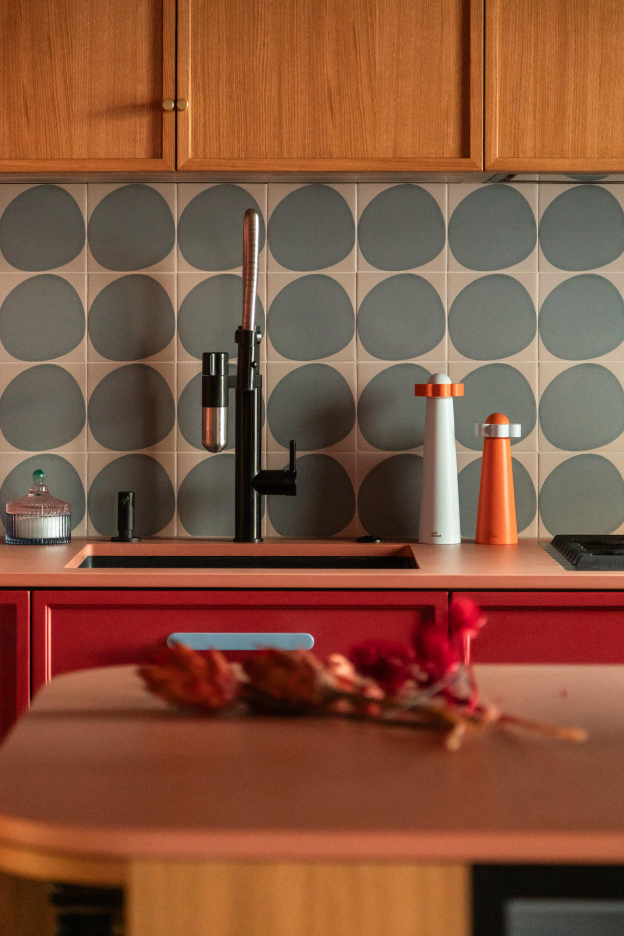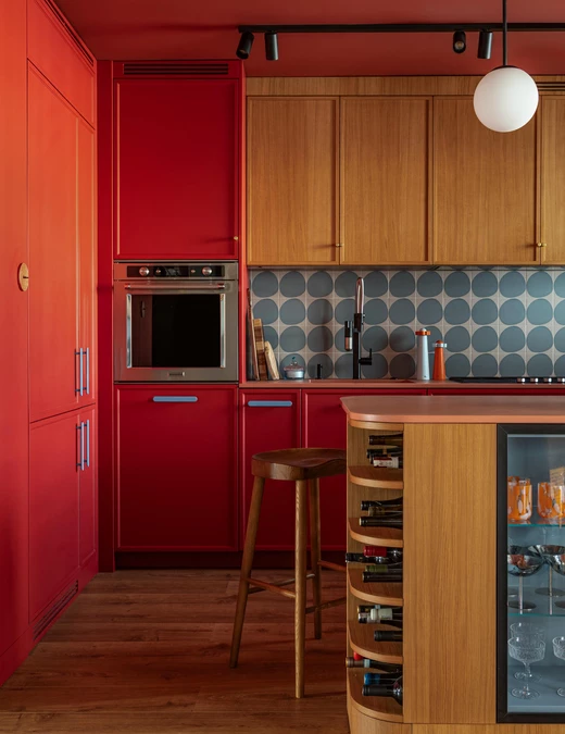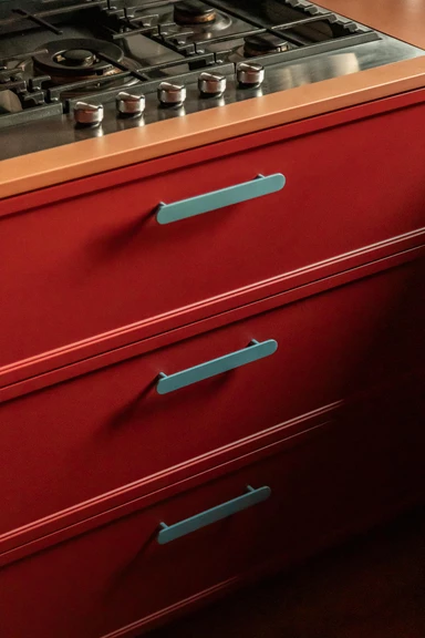Sercem przestrzeni stała się wyspa z blatem ze spieku kwarcowego w odcieniu terakoty. Jej powierzchnia musiała być odporna, trwała i gotowa na naprawdę intensywne użytkowanie. Z kolei przełamaniem kolorystycznym i kontrapunktem dla czerwieni stały się błękitne witryny, pastelowe kafelki i uchwyty.