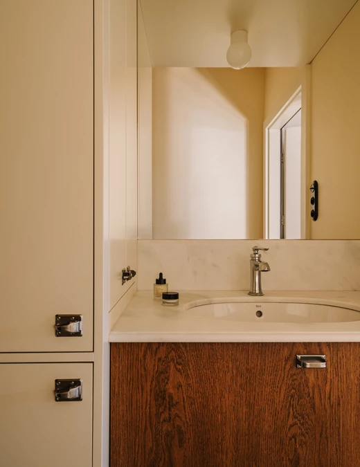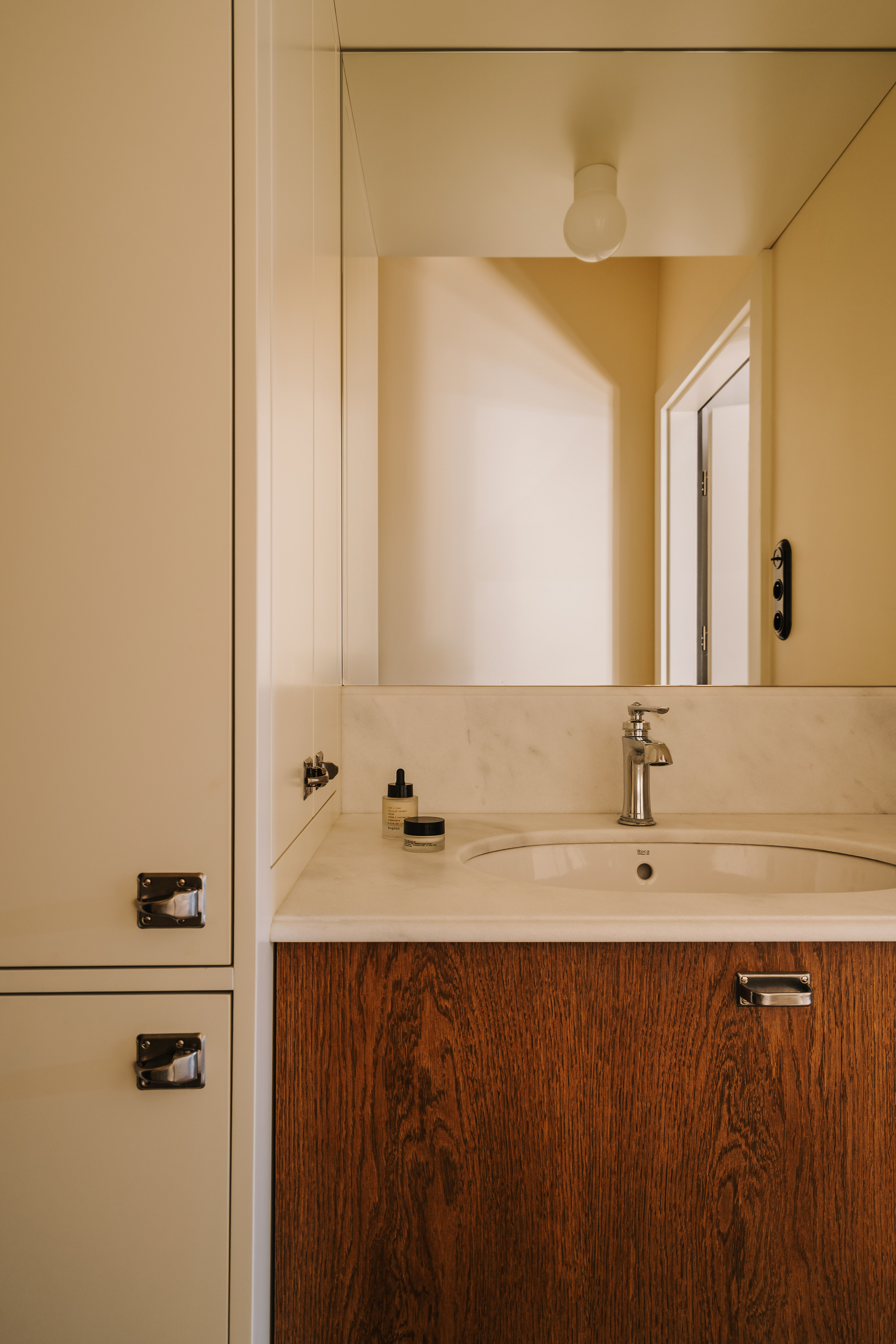 „Łazienka powstała z fragmentu dawnego korytarza, stąd jej podłużny, nietypowy kształt” – tłumaczy projektantka. W jej centrum znajduje się ściana nośna z istniejącym otworem, którego właściciele nie chcieli już modyfikować. Mimo to przestrzeń udało się zaplanować zgodnie z potrzebami: znalazło się miejsce zarówno na wannę i prysznic, jak i na dużą szafę z pralką.