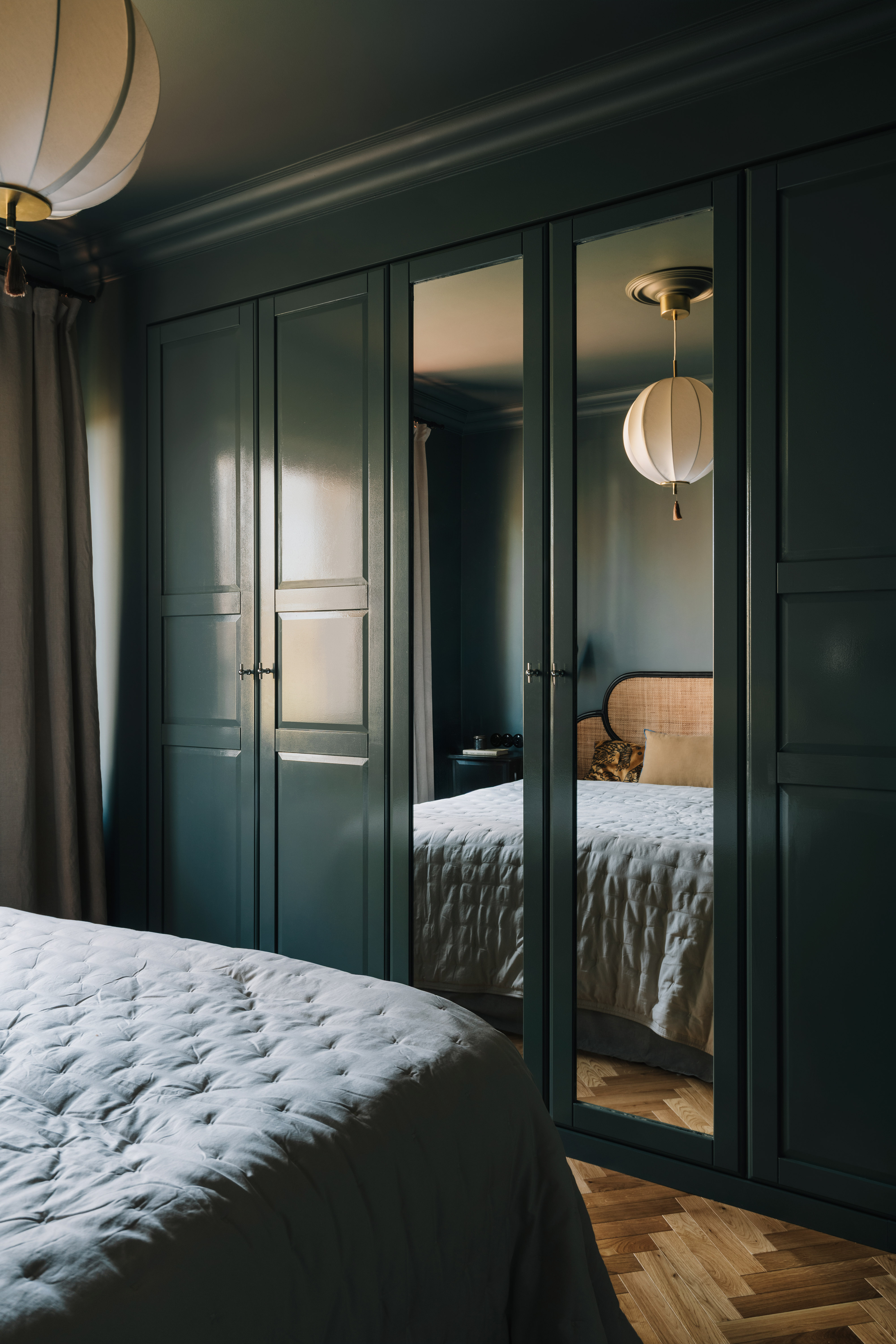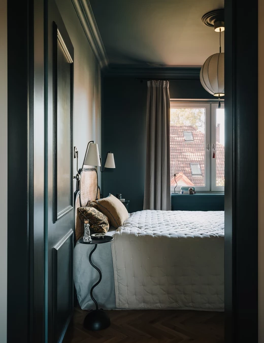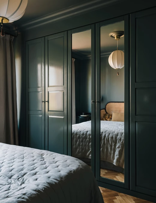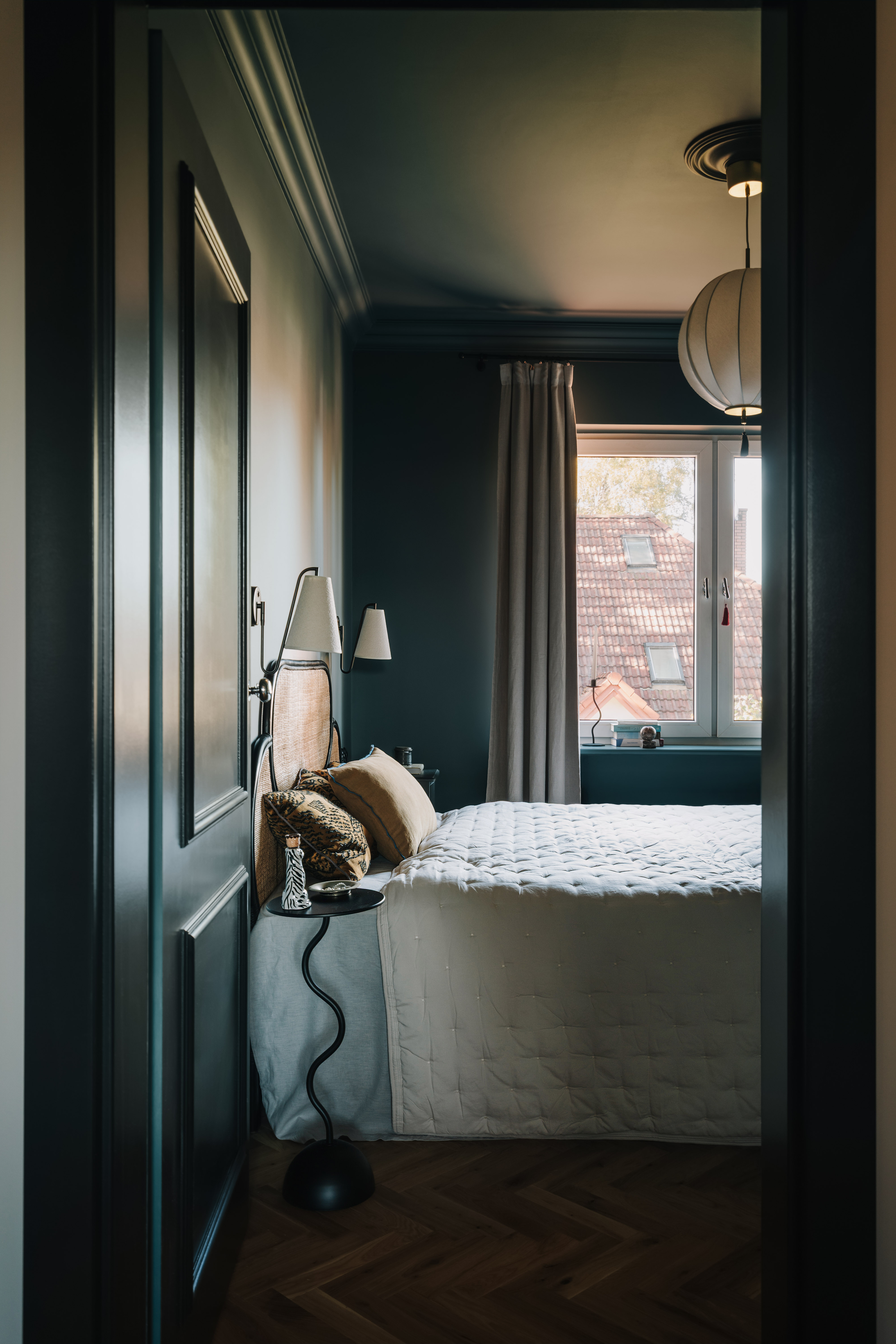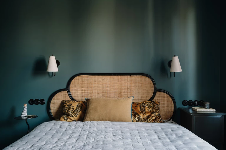 Punktem wyjścia do aranżacji sypialni był złoty odcień poduszek Dedara, które razem z właścicielami wprowadziły się do tego mieszkania. Całe pomieszczenie utrzymano w morskim błękicie, który wydobywa kolor poduszek i podkreśla ratanowe wezgłowie łóżka.