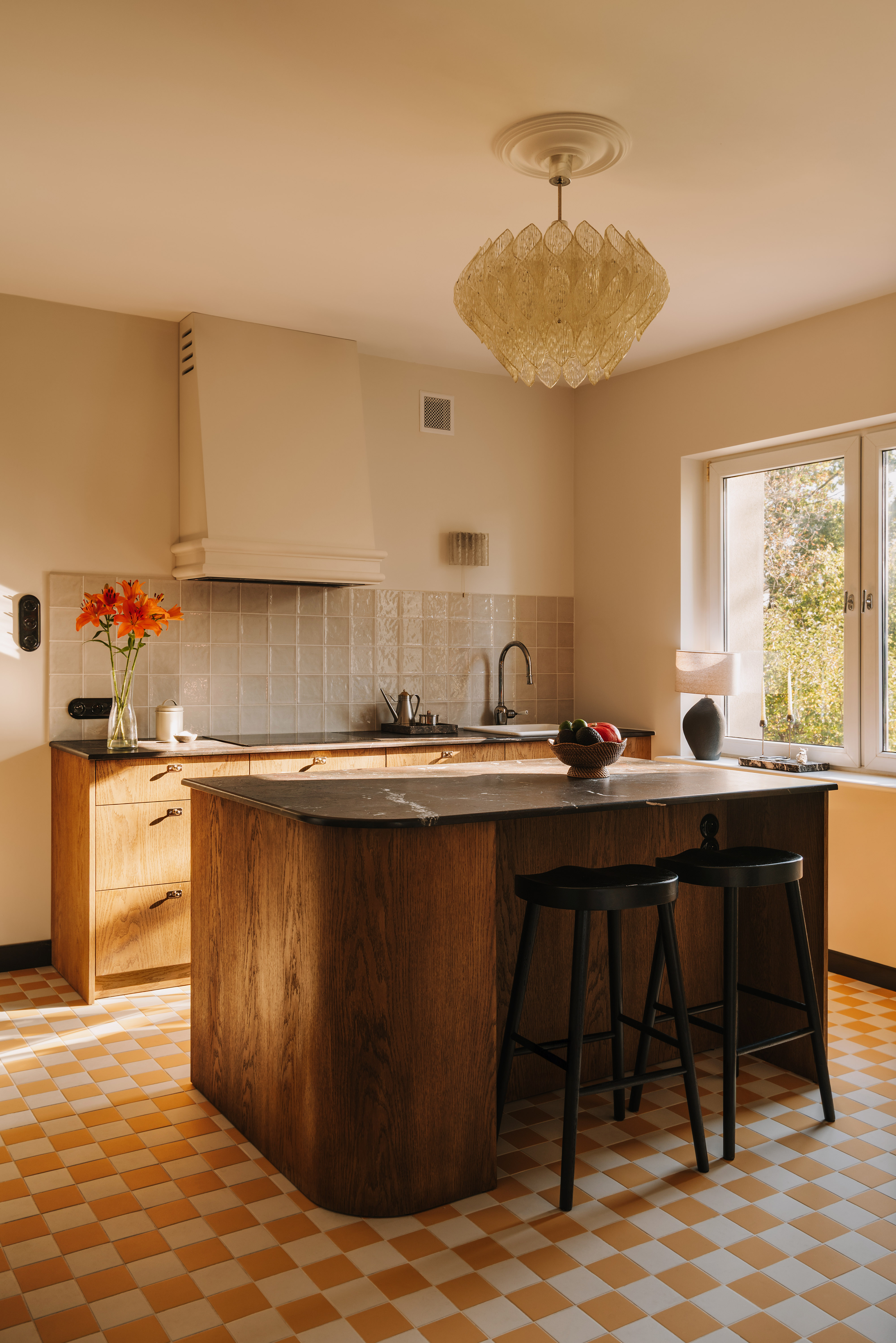 W kuchni najważniejszym elementem jest wyspa – domownicy często gotują, a najlepsze przyjęcia, jak podkreśla projektantka, zawsze odbywają się właśnie w tej części domu. Zabudowę wykonano na zamówienie z bejcowanego dębu, natomiast blat powstał z kamienia Breccia Imperiale. Charakter wnętrza dodatkowo podkreśla kinkiet vintage.