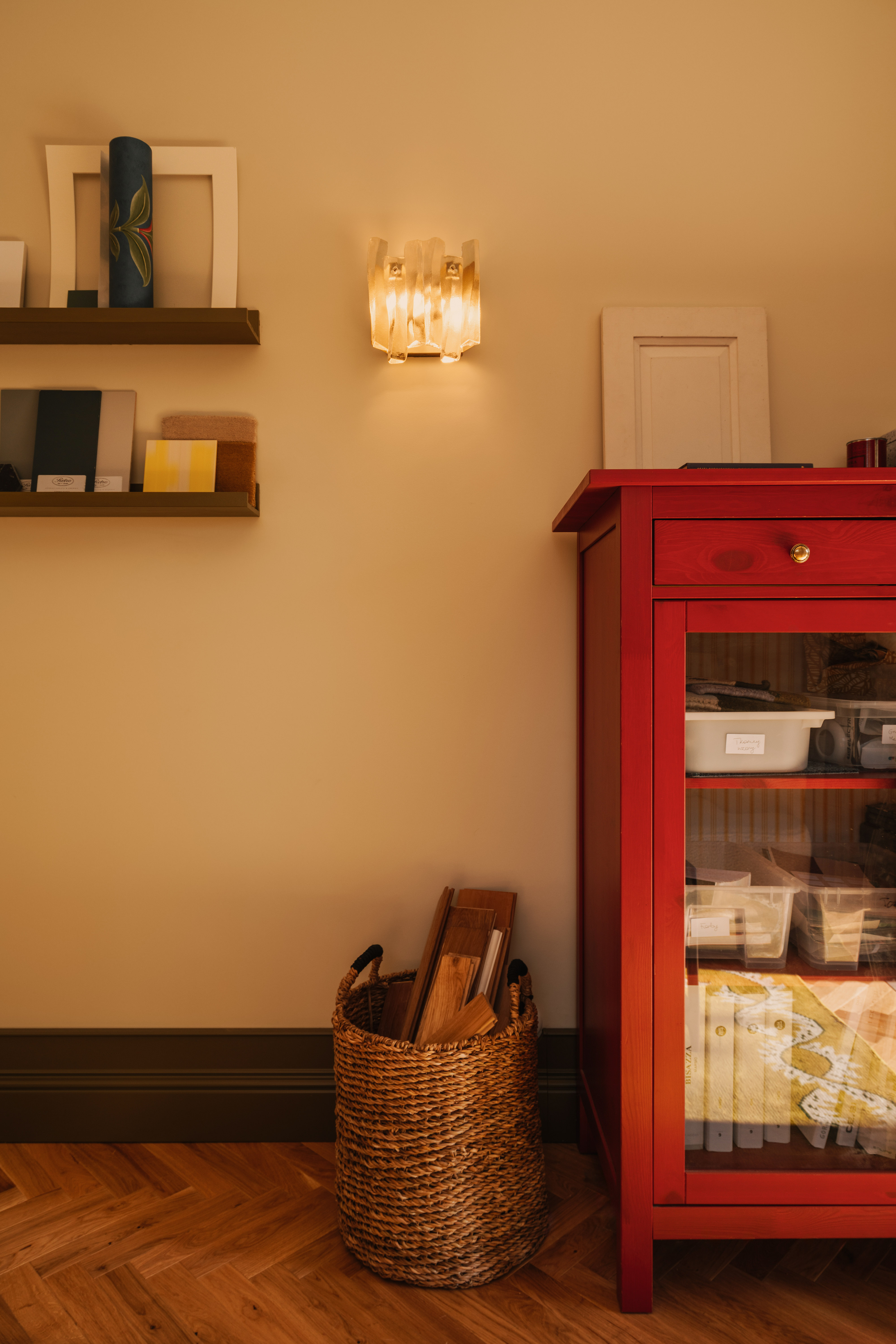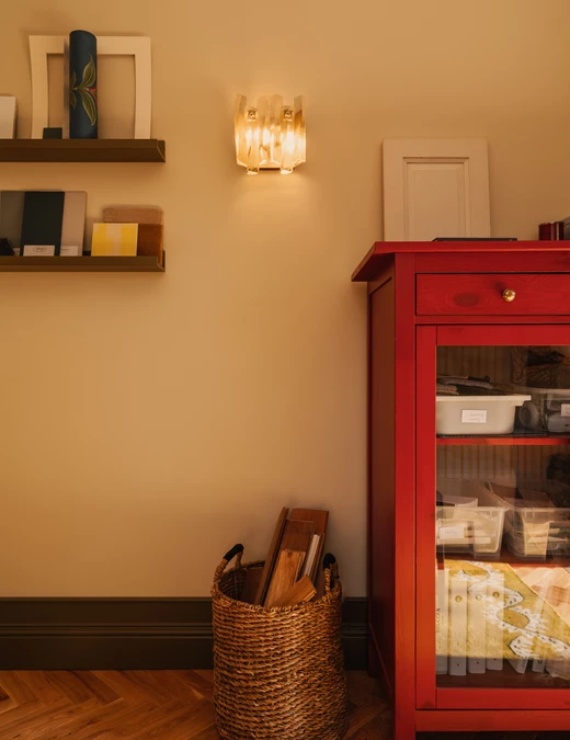 Drugim priorytetem stało się zachowanie i ponowne wykorzystanie posiadanych mebli. Po babci i tacie projektantka odziedziczyła dużą biblioteczkę, a z poprzedniego mieszkania przeniosła m.in. łóżko z ratanowym wezgłowiem oraz czerwony kredens. „Przywiązuję się do przedmiotów, tym bardziej tych odziedziczonych po przodkach – mam nadzieję, że jest to jakaś nić łącząca mnie z nimi, pomimo tego, że dziś nie ma ich już wśród nas”.