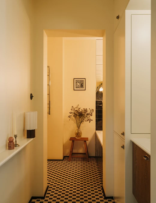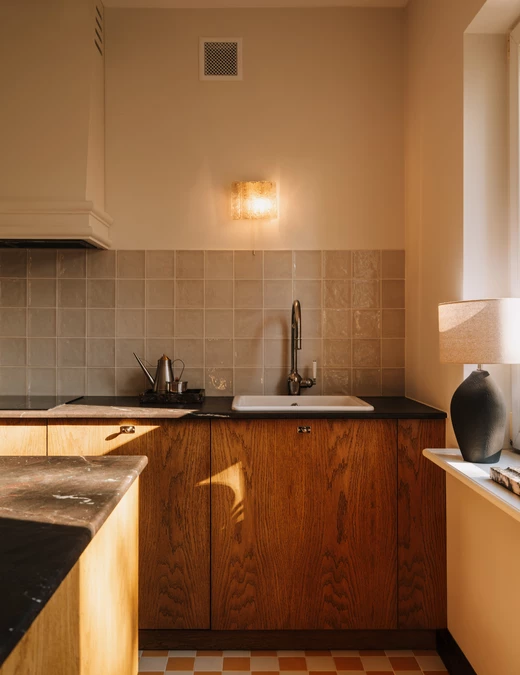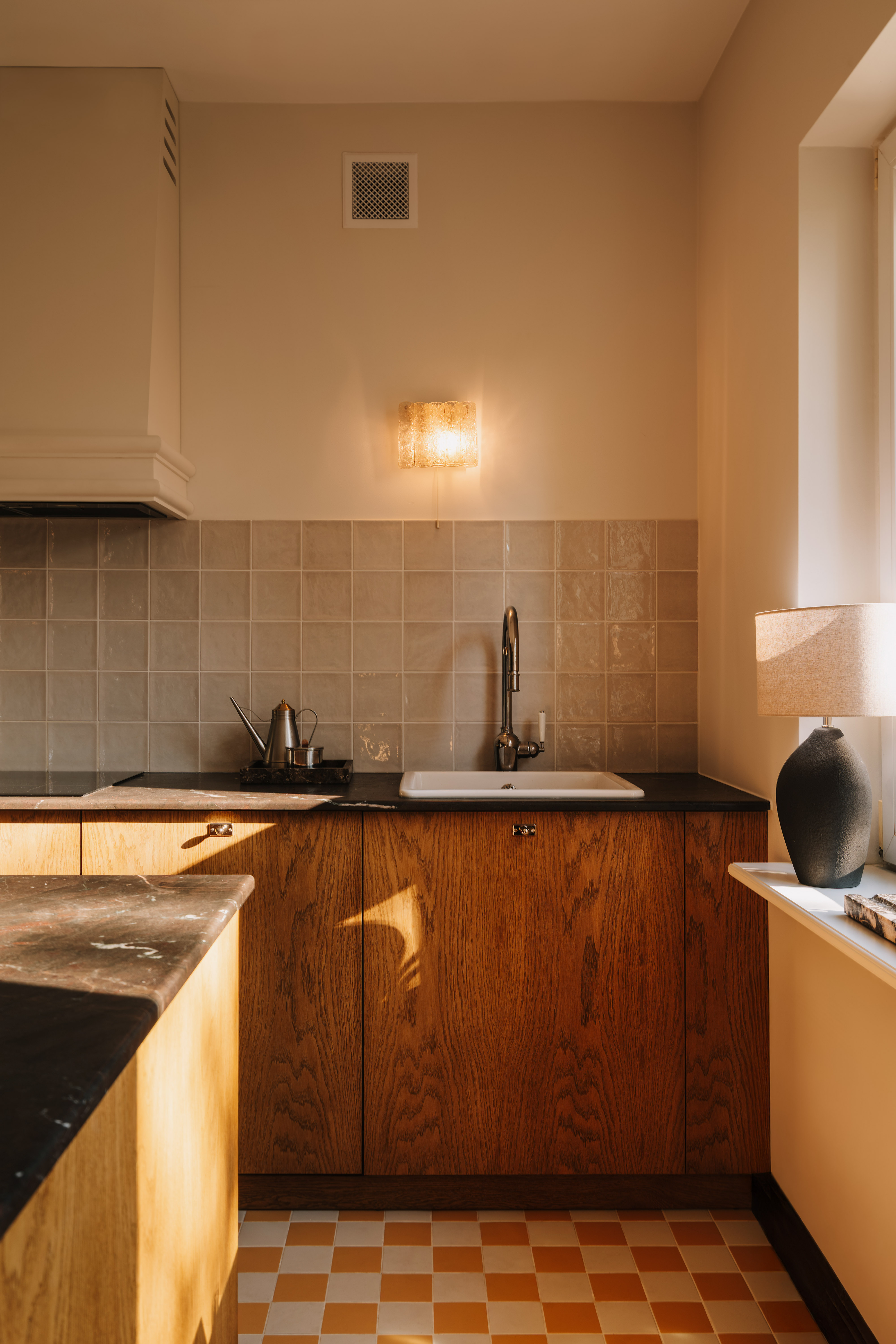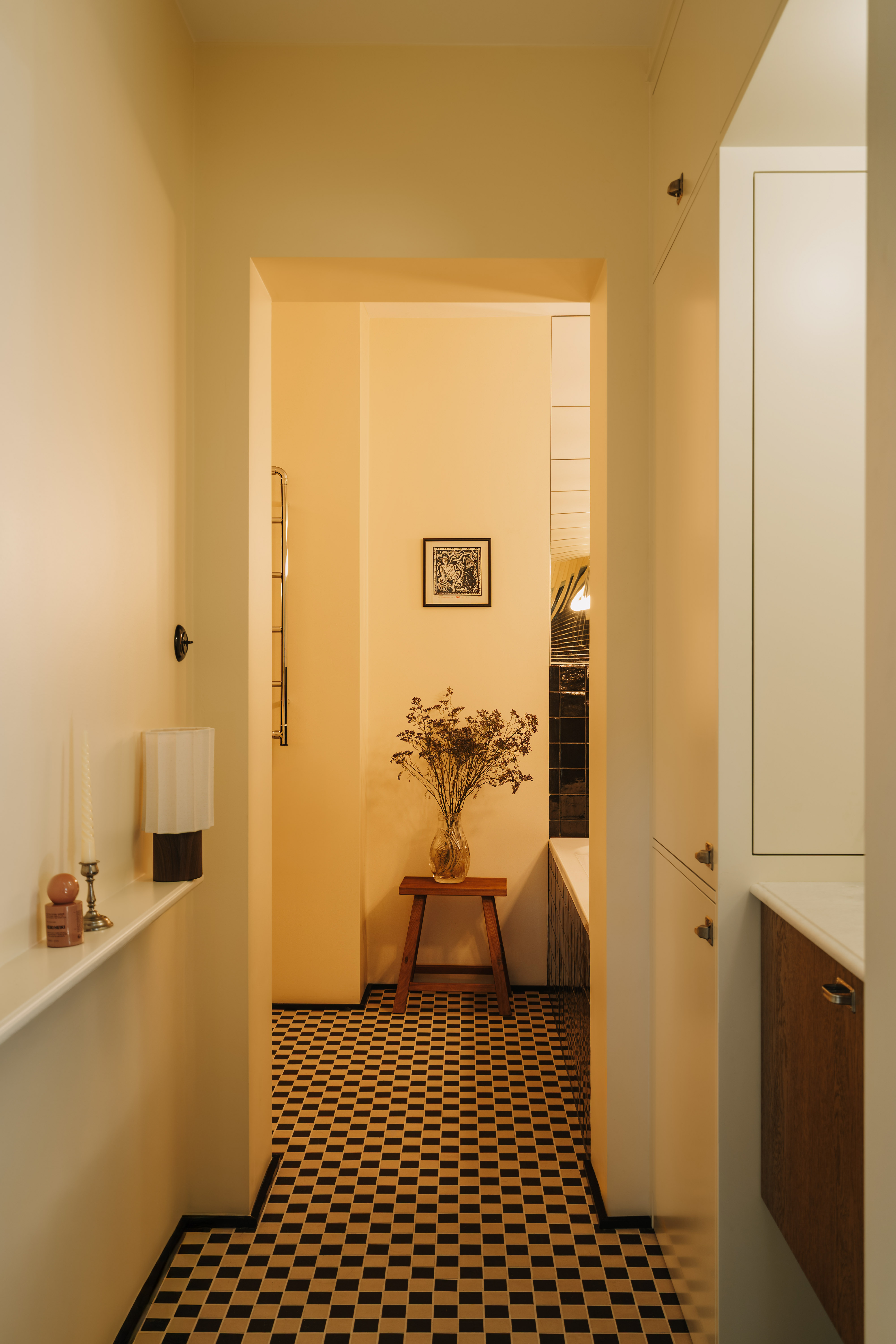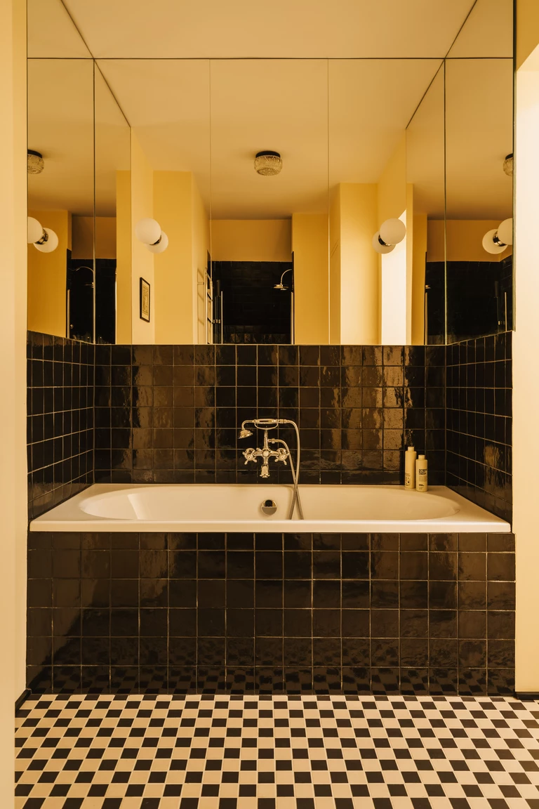 „Kocham modernizm oraz łazienki z lat 20. i 30. XX wieku, dlatego bardzo się cieszyłam, że w końcu mogłam zdecydować się na czarne kafle i dość surową szachownicę. Lubię taką prostotę z retro sznytem i pamiętam, że gdy mój znajomy (również architekt) po raz pierwszy zobaczył zdjęcia tego wnętrza, stwierdził, że panuje tu dekadencka atmosfera – co dobrze oddaje klimat tamtych czasów”.