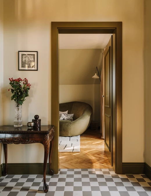 Pierwsze skrzypce odgrywa tu duże biurko po dziadkach. „Do tego dobrałam spokojny, piaskowy odcień zieleni oraz oliwkowe drzwi i cokoły”.