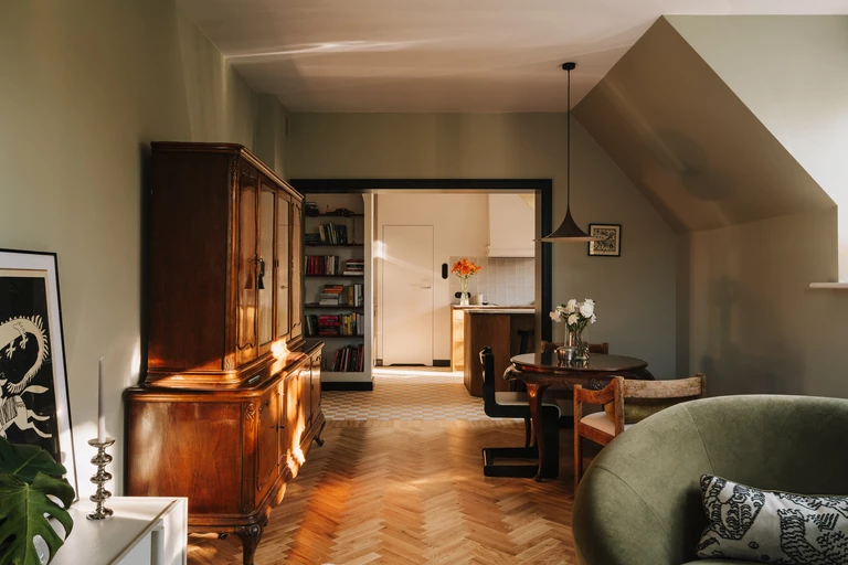 Sercem salonu stały się biblioteczka oraz zabytkowy stół odziedziczone po babci, którym towarzyszą krzesła vintage z poprzedniego mieszkania. Całość dopełnia oliwkowa kanapa znaleziona przez projektantkę na Piccothefinder.