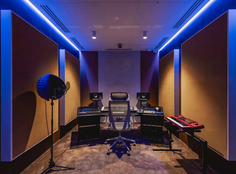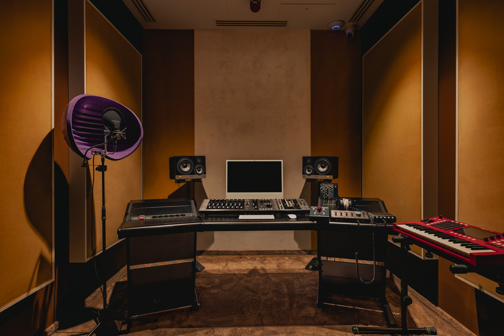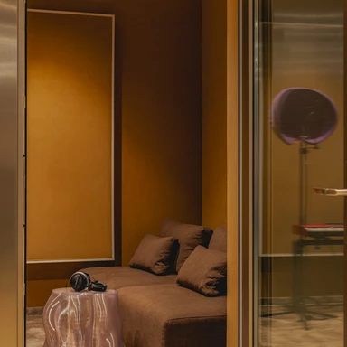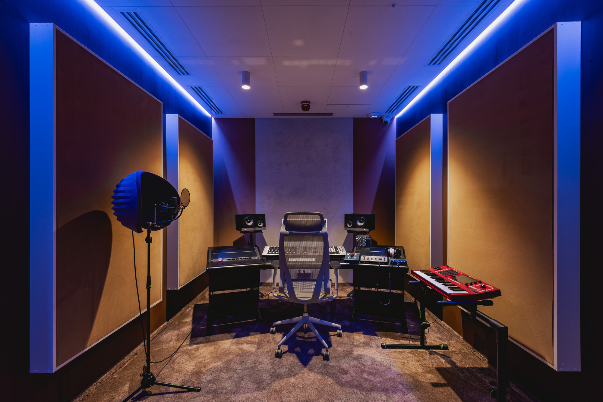Część przeznaczona do rejestracji dźwięku została zaprojektowana jako azyl wyciszenia i pełnego skupienia. Są to harmonijne, dopracowane pod kątem akustycznym wnętrza, sprzyjające pracy w formacie jeden na jeden. Dominuje tu stonowana, ciepła paleta barw oparta o brązy oraz ochrę, co ułatwia koncentrację podczas procesu twórczego. Istotną rolę odgrywa również światło - jego natężenie można indywidualnie regulować, dostosowując atmosferę do aktualnego nastroju i potrzeb artysty. Dzięki temu strefa ta pozwala na całkowite odcięcie się od zewnętrznego zgiełku.