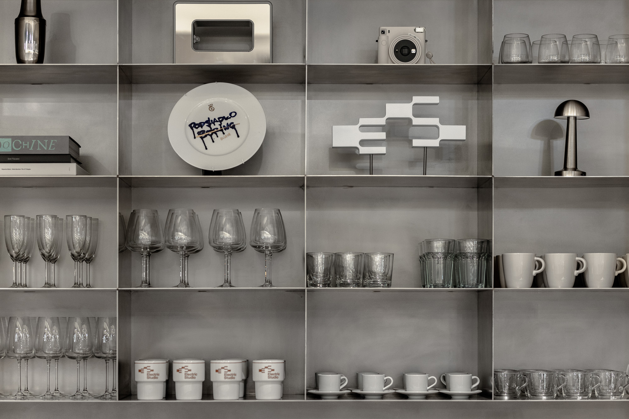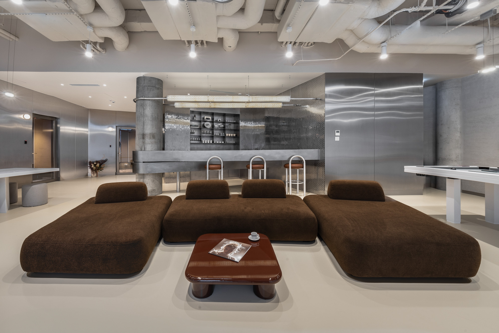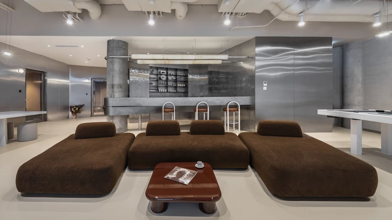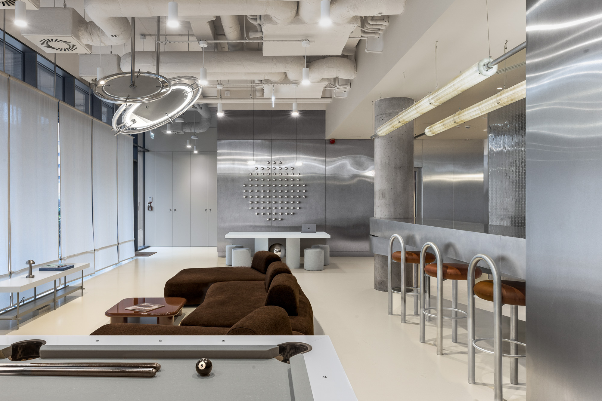Dominującym materiałem jest stal nierdzewna, którą wykorzystano zarówno jako okładzinę ścienną, jak i w zabudowie baru oraz kuchni. Jej chłodny, techniczny charakter zestawiono z miękką sofą i stolikiem kawowym w odcieniu czekoladowego brązu, co tworzy wyrafinowany kontrast materiałowy.