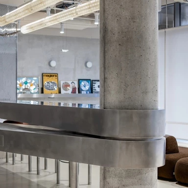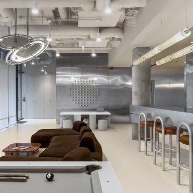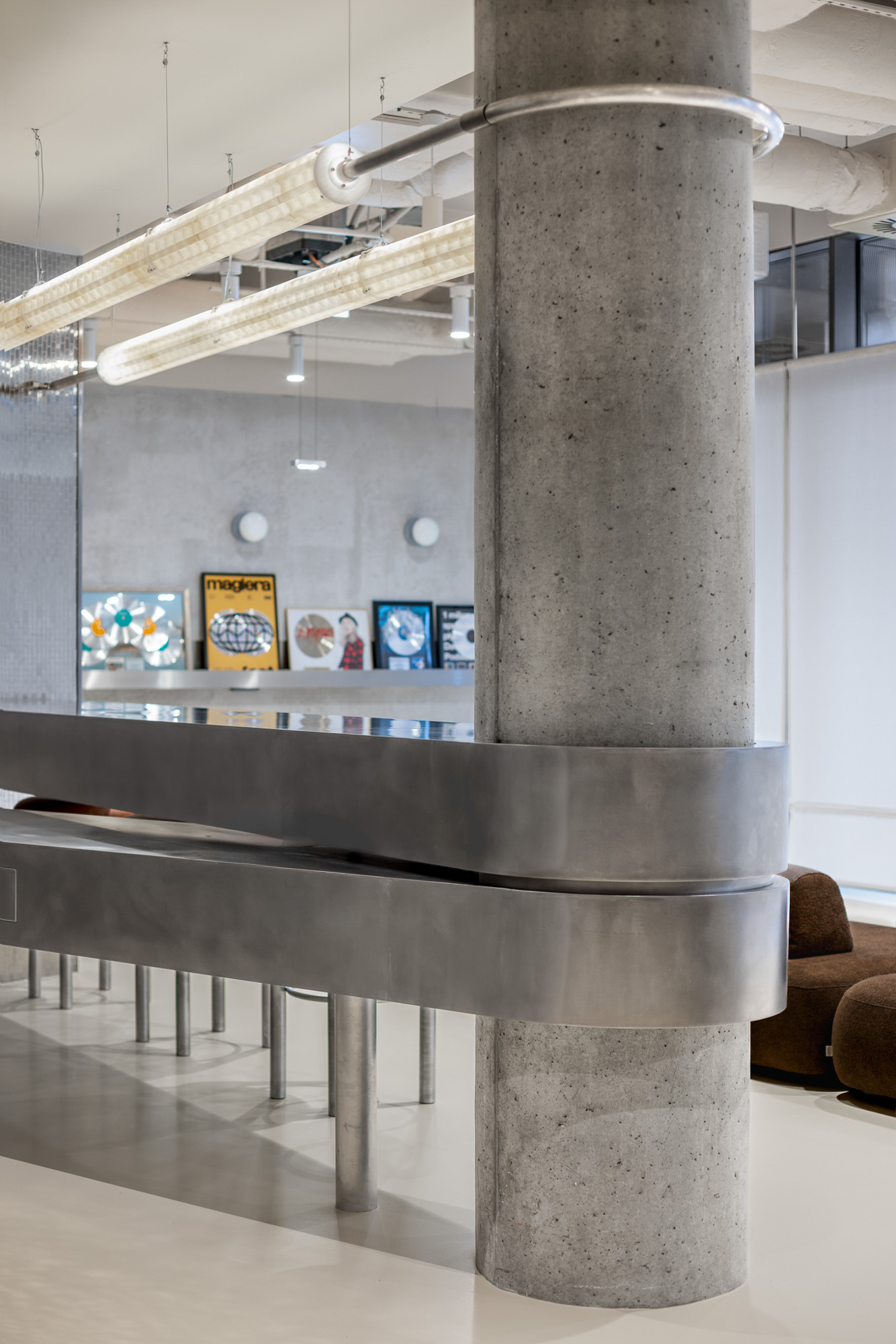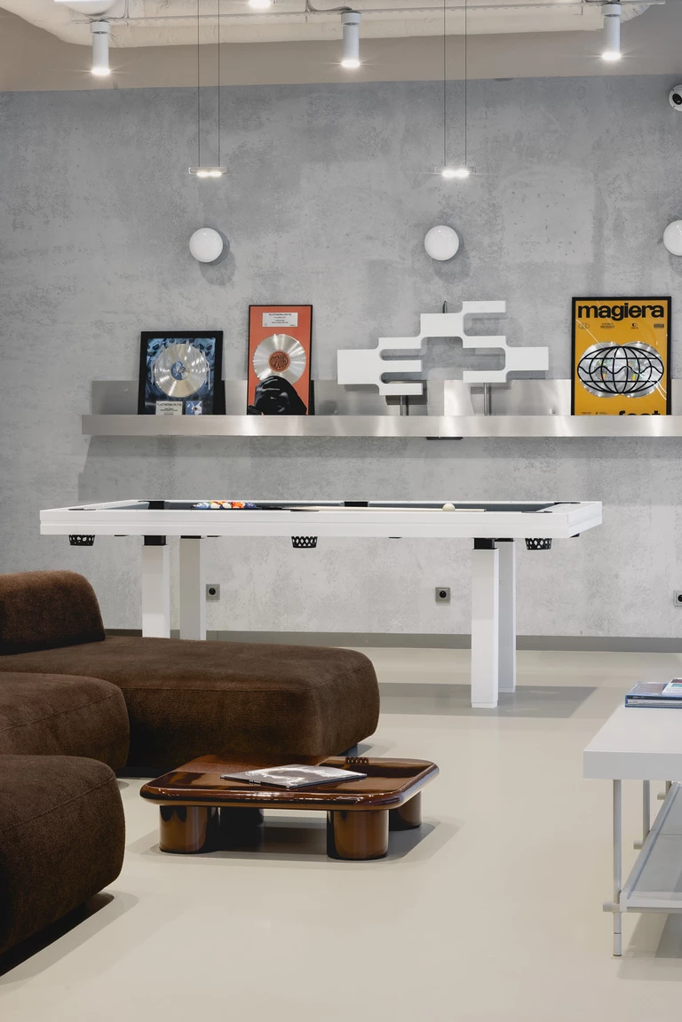 Wyraźnym przeciwieństwem dla wyciszonej strefy nagrań jest przestrzeń spotkań, która estetyką nawiązuje do futurystycznych wnętrz rodem z produkcji science fiction. Jest to miejsce otwarte i pełne energii, zaprojektowane z myślą o rozmowach, wspólnym słuchaniu muzyki oraz kameralnych wydarzeniach promujących twórczość artystów. Wszystkie elementy wyposażenia powstały na indywidualne zamówienie, co podkreśla unikatowy charakter tego konceptu.