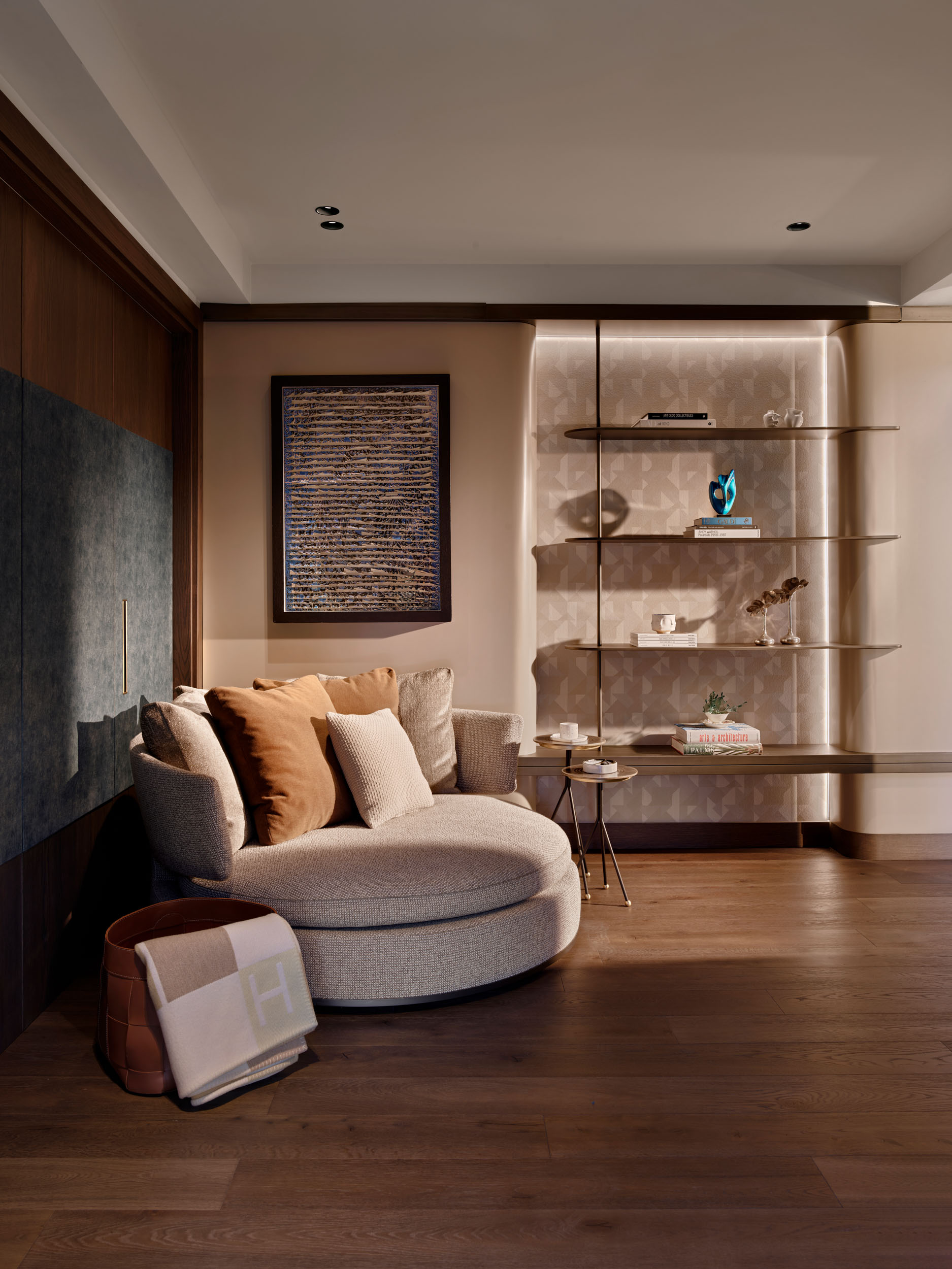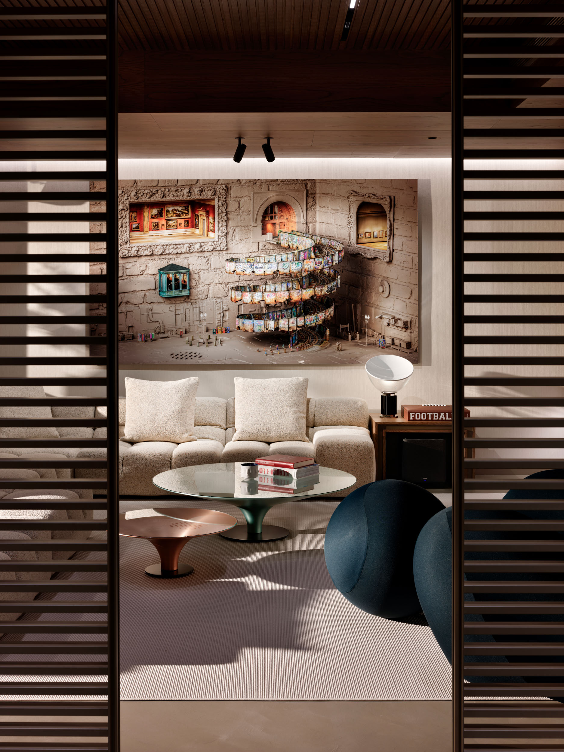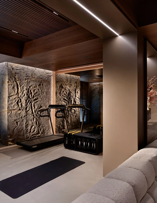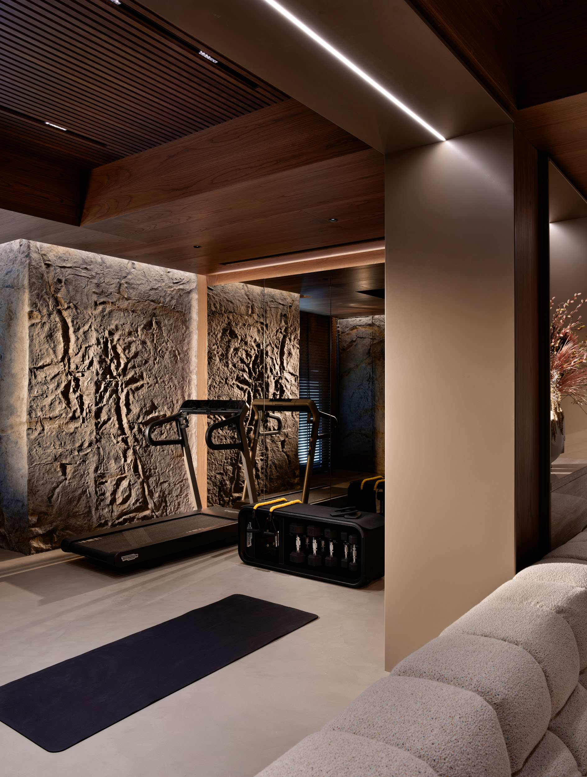 W podziemiu architekci zaplanowali strefę rekreacyjną – pokój z kinem domowym, siłownię i kuchnię pomocniczą. Pomieszczenia bez dostępu do naturalnego światła, takie jak pralnia, garderoby i zaplecze techniczne projektanci rozmieścili w środkowej części kondygnacji. W tej strefie dominują ciemniejsze kolory, surowe wykończenia i miękkie meble, które nadają wnętrzu kameralny charakter.