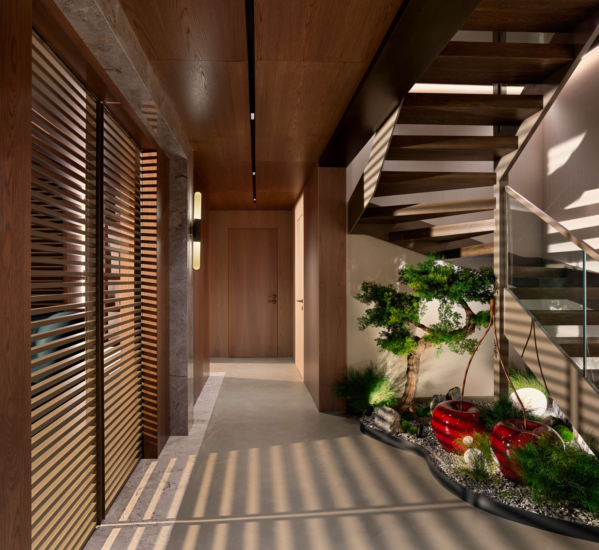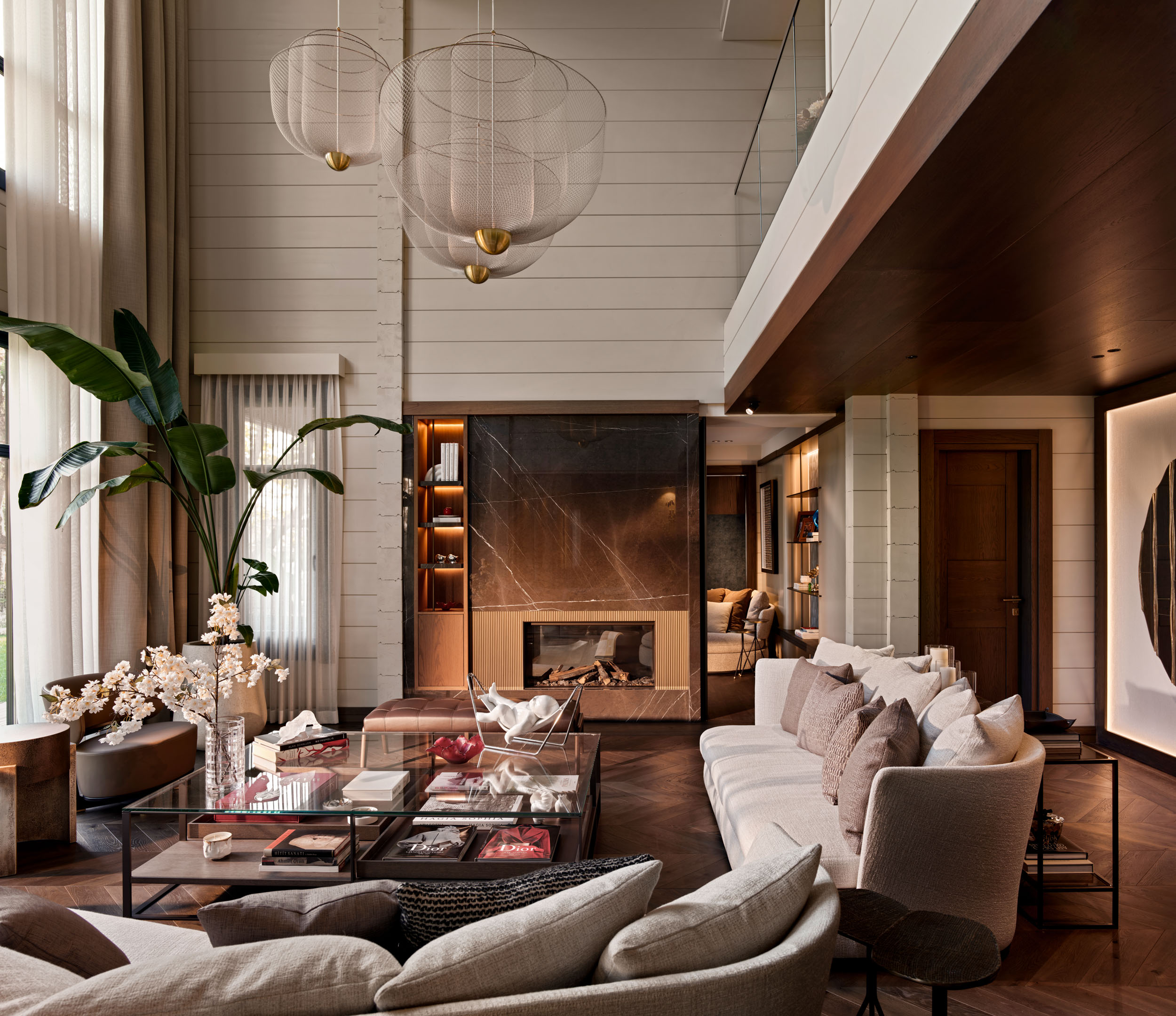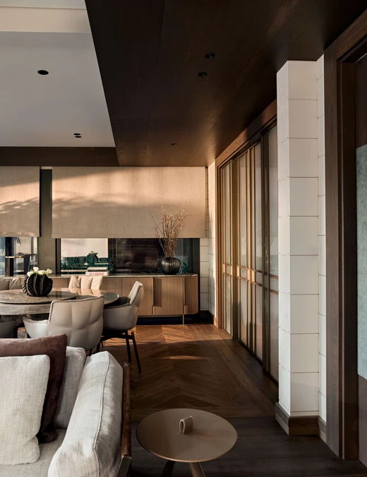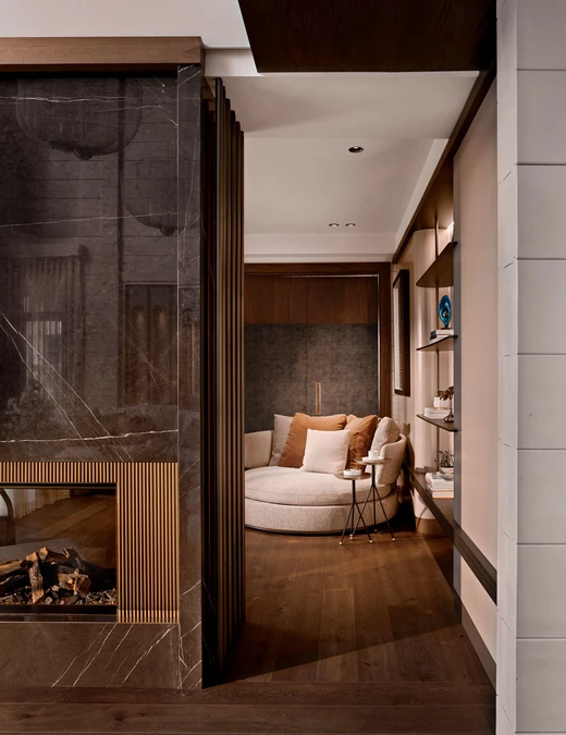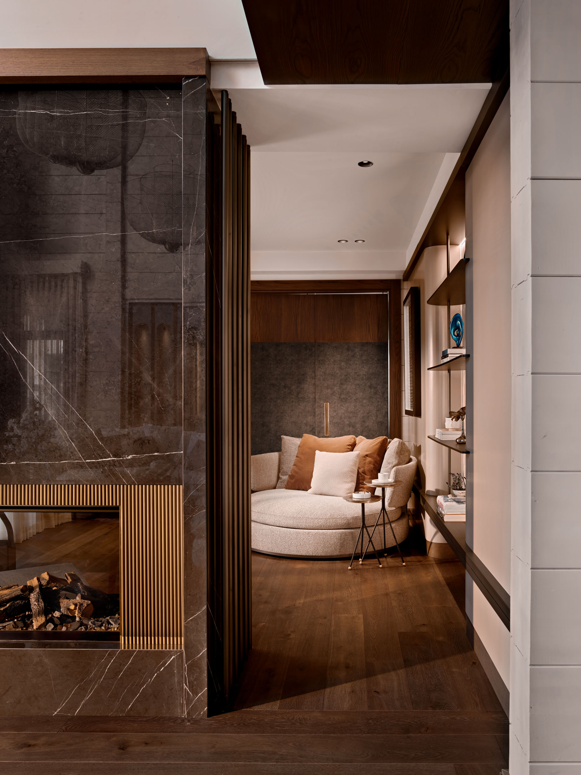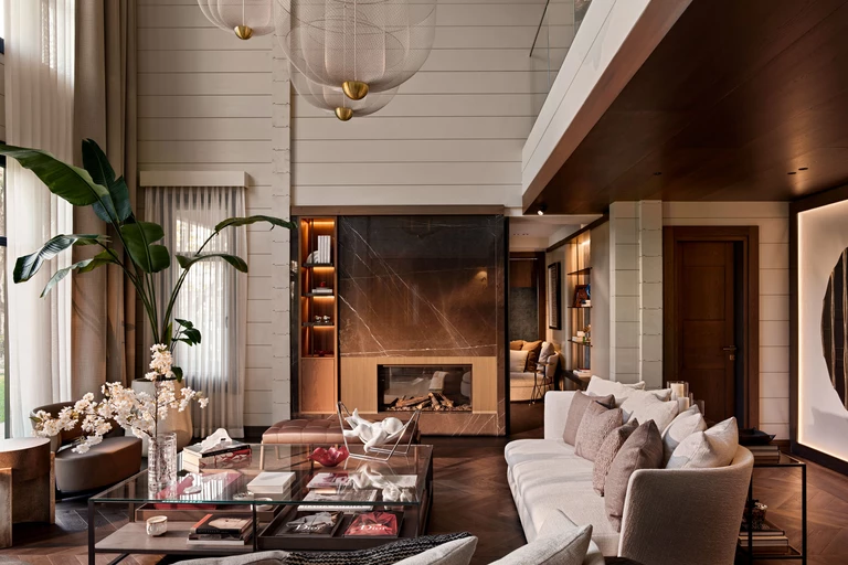 Wnętrza wzbogacają kamień, mosiądz i tkaniny o ciepłej fakturze. Centralnym punktem strefy dziennej jest dwustronny kominek, który oddziela część wypoczynkową od salonu. Przesuwne i składane drzwi umożliwiają dowolne kształtowanie przestrzeni, w zależności od potrzeb domowników.
