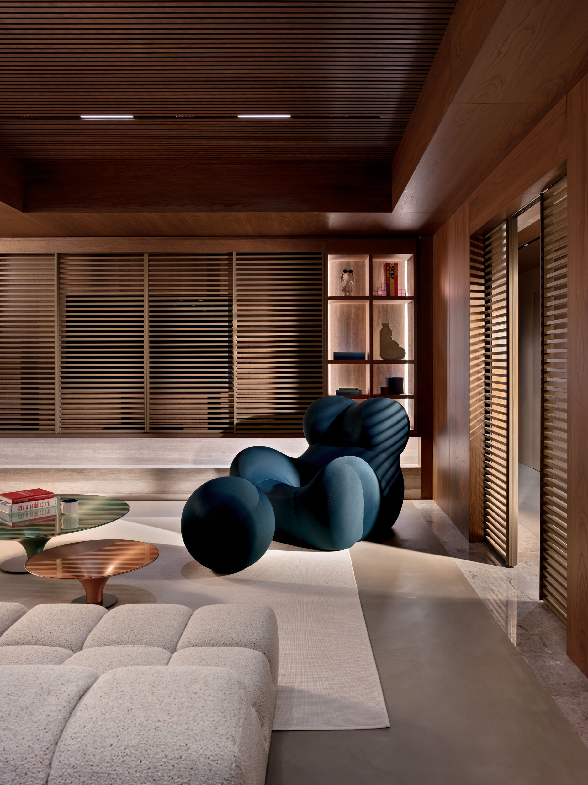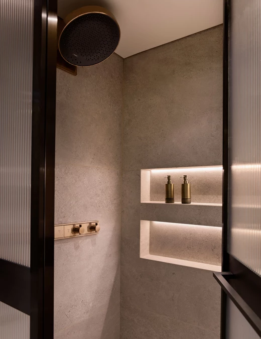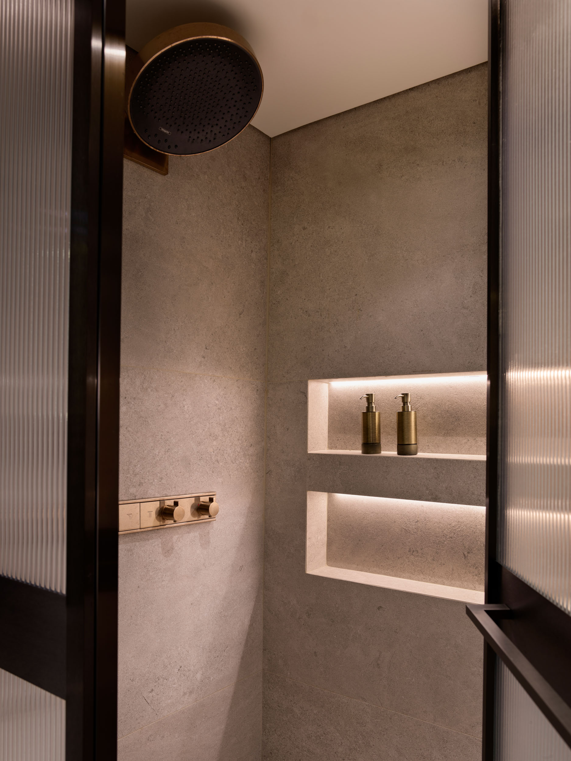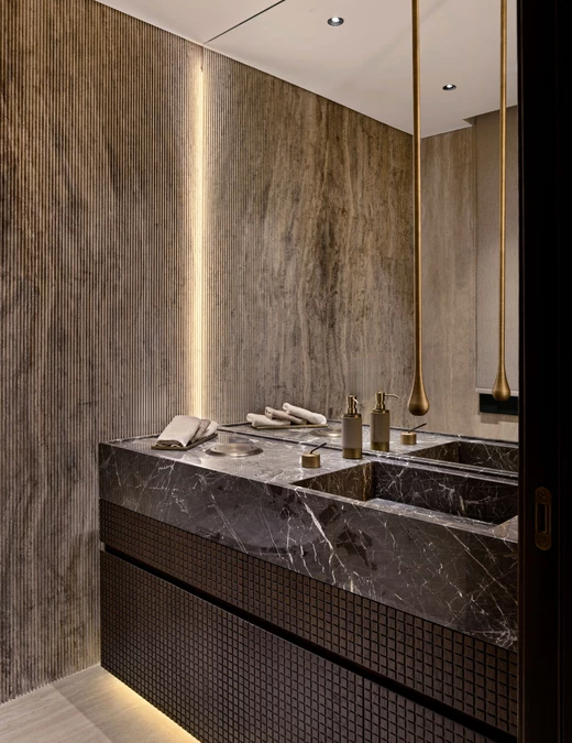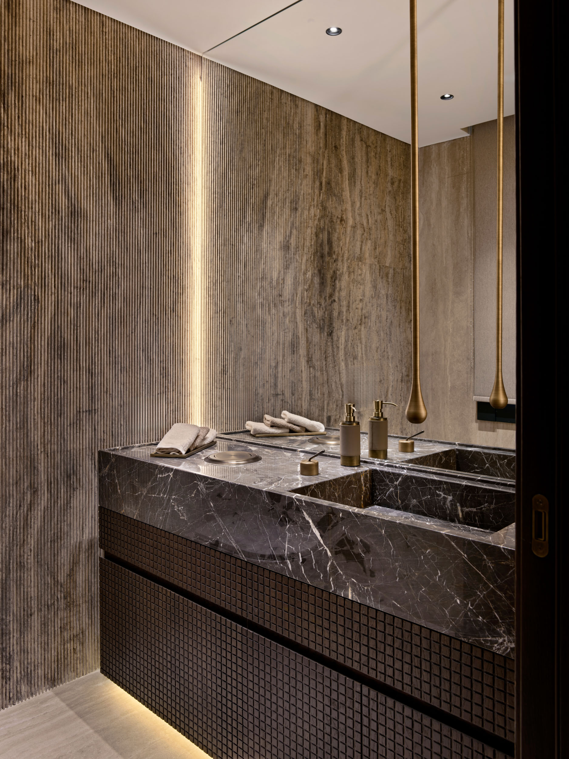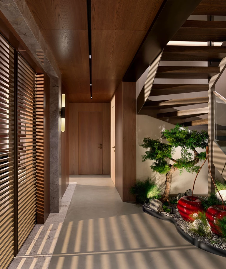 Wnętrza wzbogacają kamień, mosiądz i tkaniny o ciepłej fakturze. Centralnym punktem strefy dziennej jest dwustronny kominek, który oddziela część wypoczynkową od salonu. Przesuwne i składane drzwi umożliwiają dowolne kształtowanie przestrzeni, w zależności od potrzeb domowników.