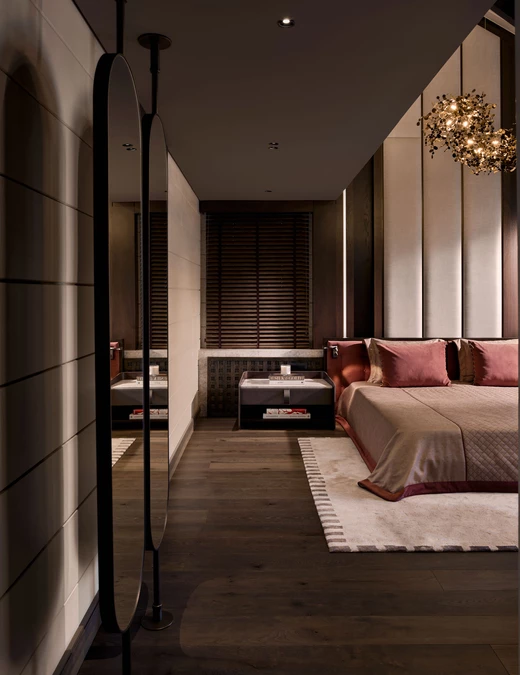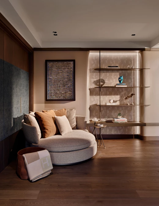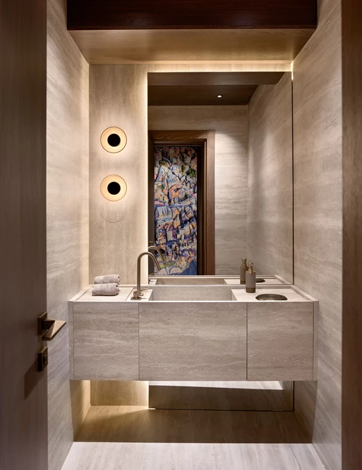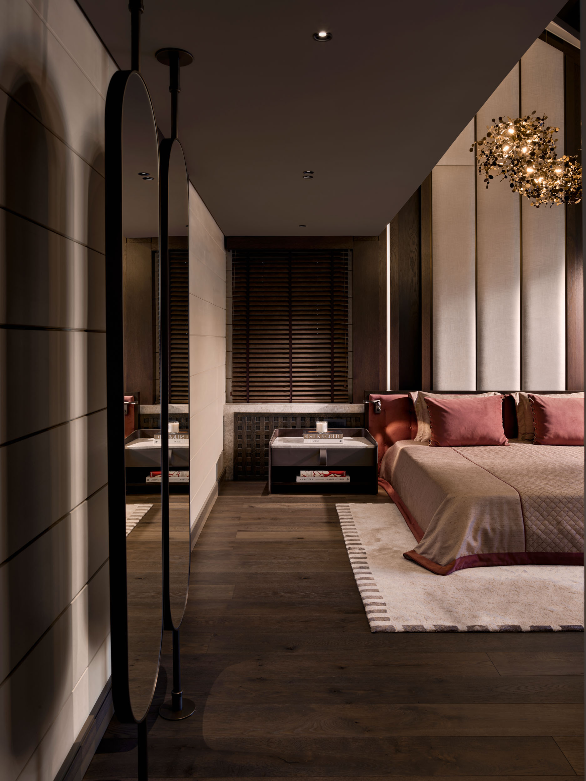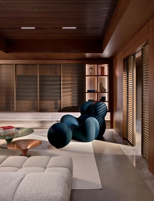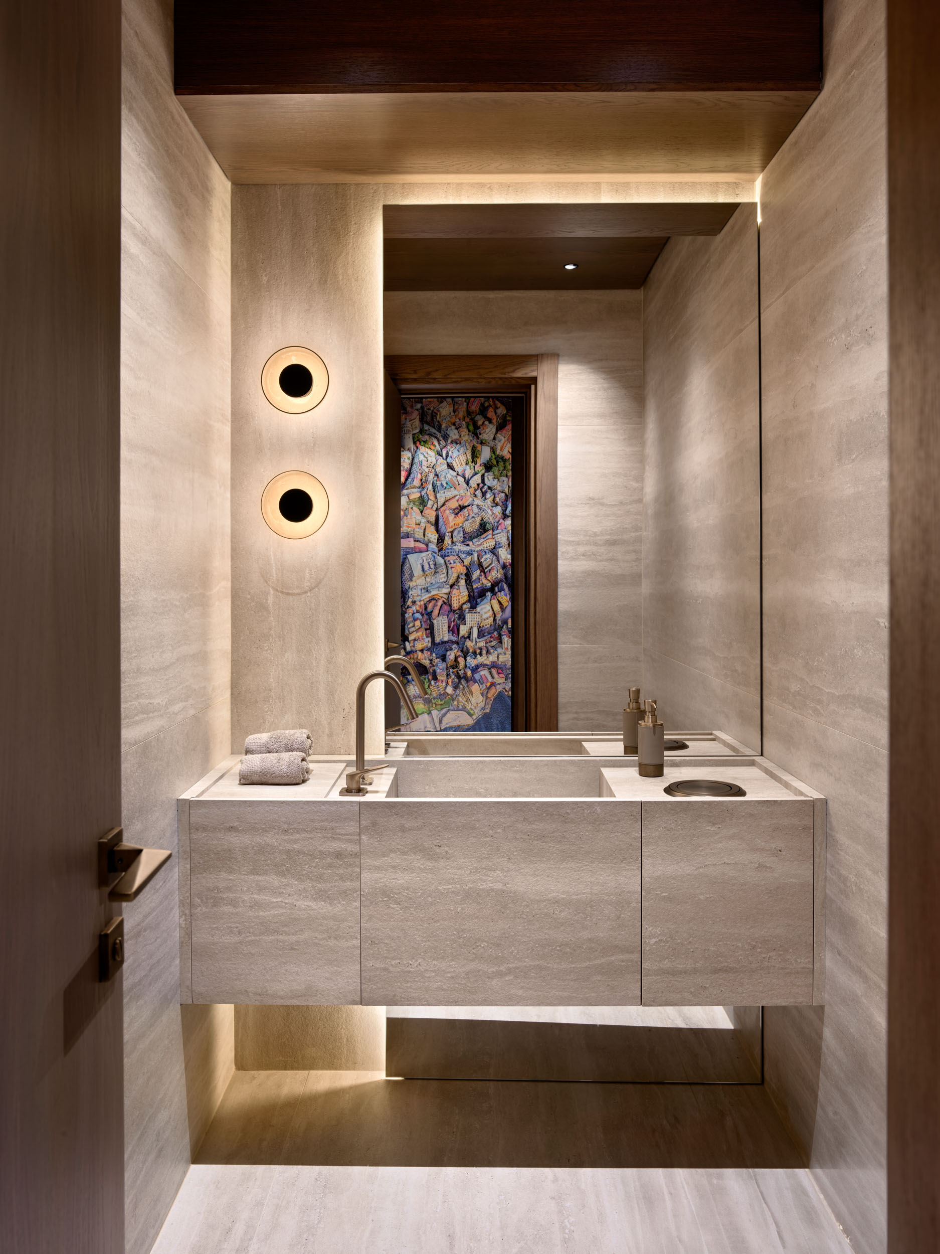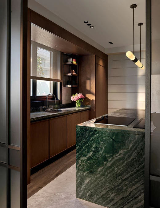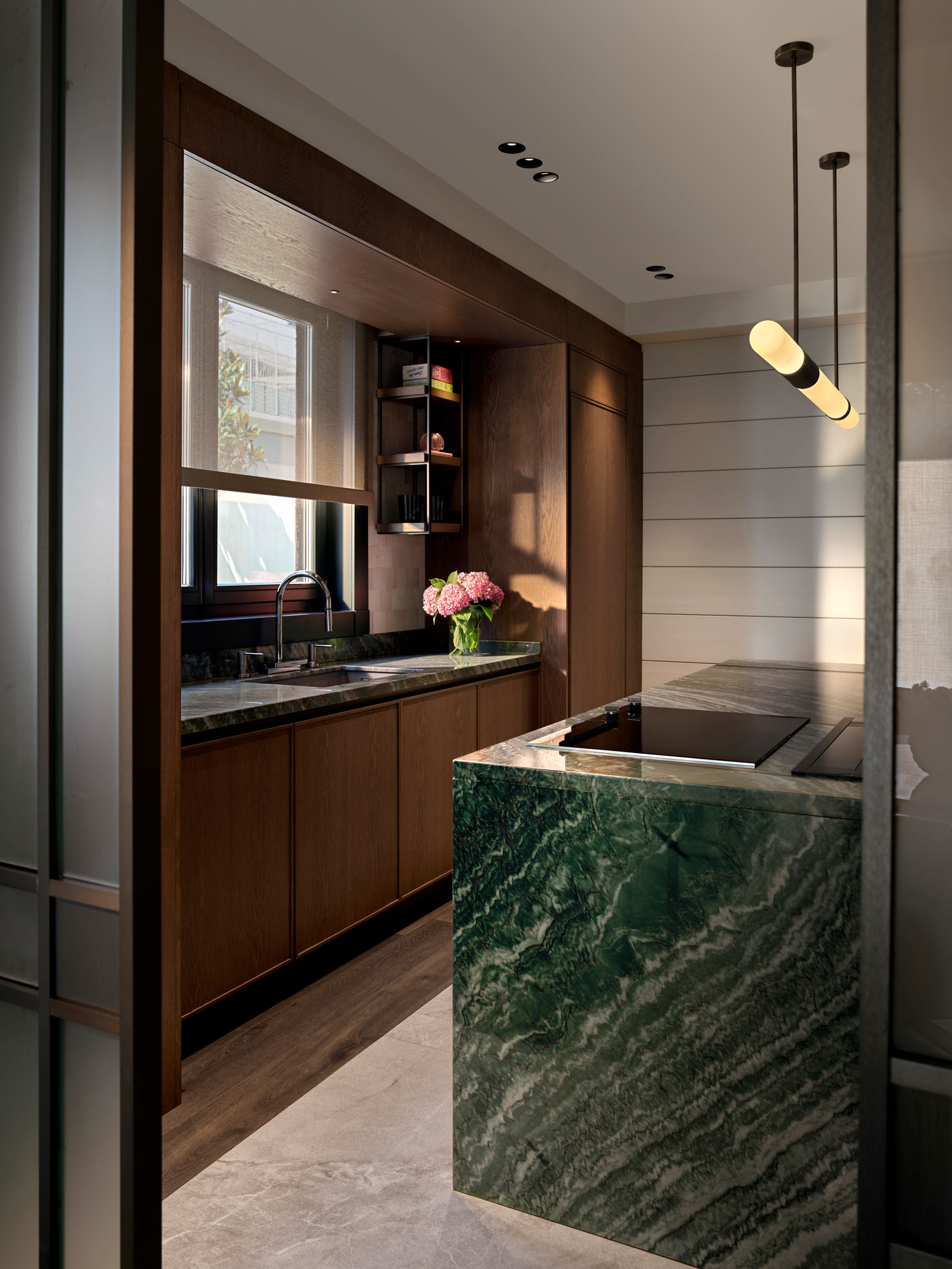 Wnętrza wzbogacają kamień, mosiądz i tkaniny o ciepłej fakturze. Centralnym punktem strefy dziennej jest dwustronny kominek, który oddziela część wypoczynkową od salonu. Przesuwne i składane drzwi umożliwiają dowolne kształtowanie przestrzeni, w zależności od potrzeb domowników.