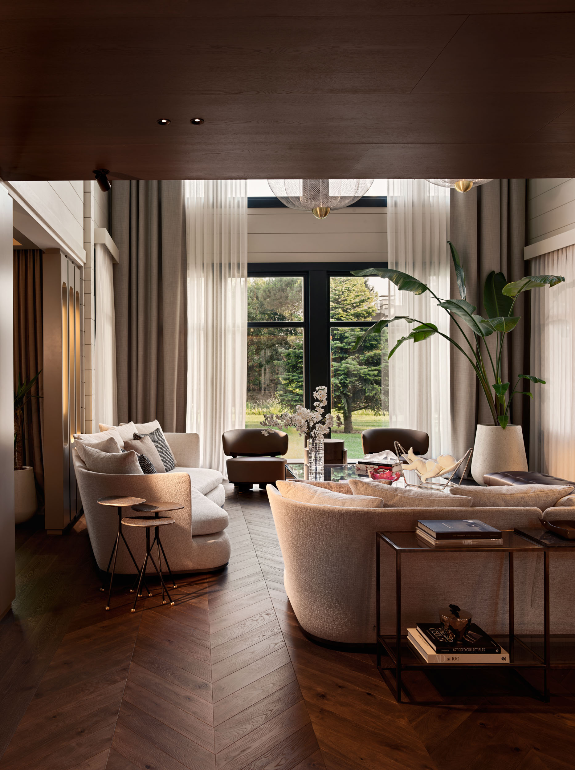 Parter pełni funkcję dzienną. Otwarty układ pomieszczeń łączy salon, kuchnię, jadalnię i ogród zimowy. Architekci z biura XYZ Design, odpowiedzialni za konstrukcję i wnętrze domu, postanowili utrzymać przestrzeń w neutralnej tonacji beżu i brązu, która współgra z naturalną strukturą drewna.