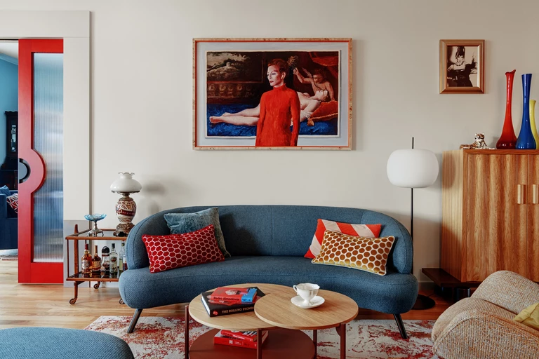 W centralnym miejscu w salonie, nad sofą, wyeksponowano obraz, który architektka wnętrz namalowała specjalnie na potrzeby projektu. To kadr z filmu Pedro Almodóvara „Ludzki głos”, który przedstawia aktorkę Tildę Swinton stojącą na tle barokowego obrazu Artemisii Gentileschi. „Bardzo często maluję obrazy do zaprojektowanych przeze mnie wnętrz. Są dla mnie ostatecznym dopełnieniem przestrzeni, przysłowiową klamrą, którą spinam ją w spójną całość” – mówi Marta.