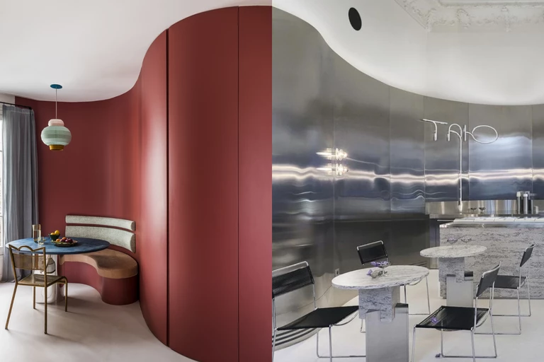 Francuska pracownia Batiik Studio ma słabość do wyrazistych kolorów i niestandardowych form. Falowana, burgundowa zabudowa przechodzi płynnie w ścianę o tym samym kolorze.
